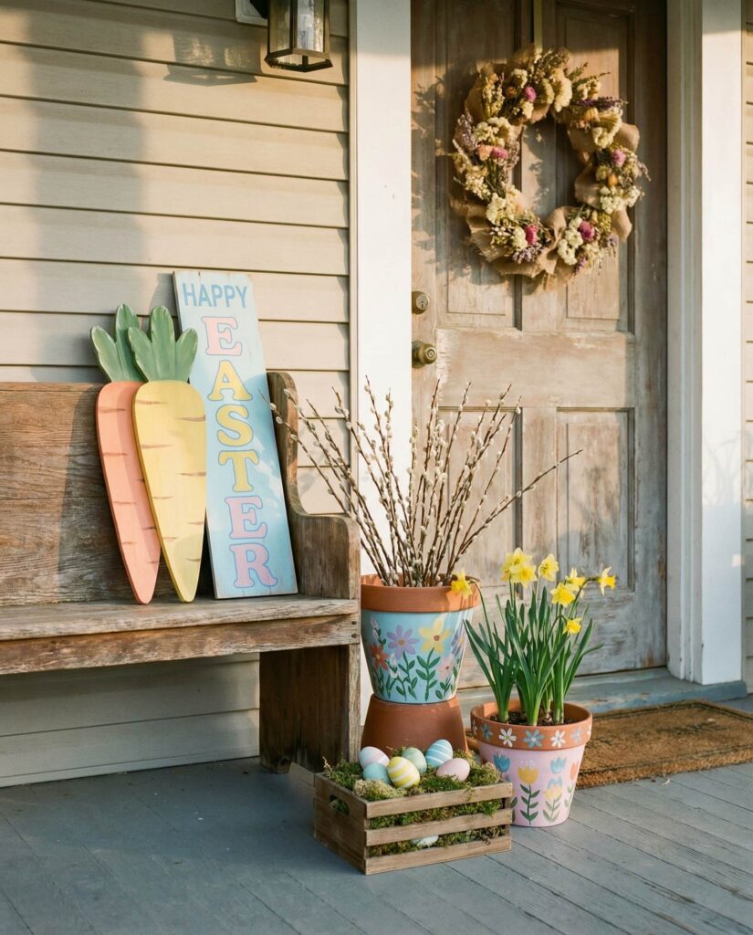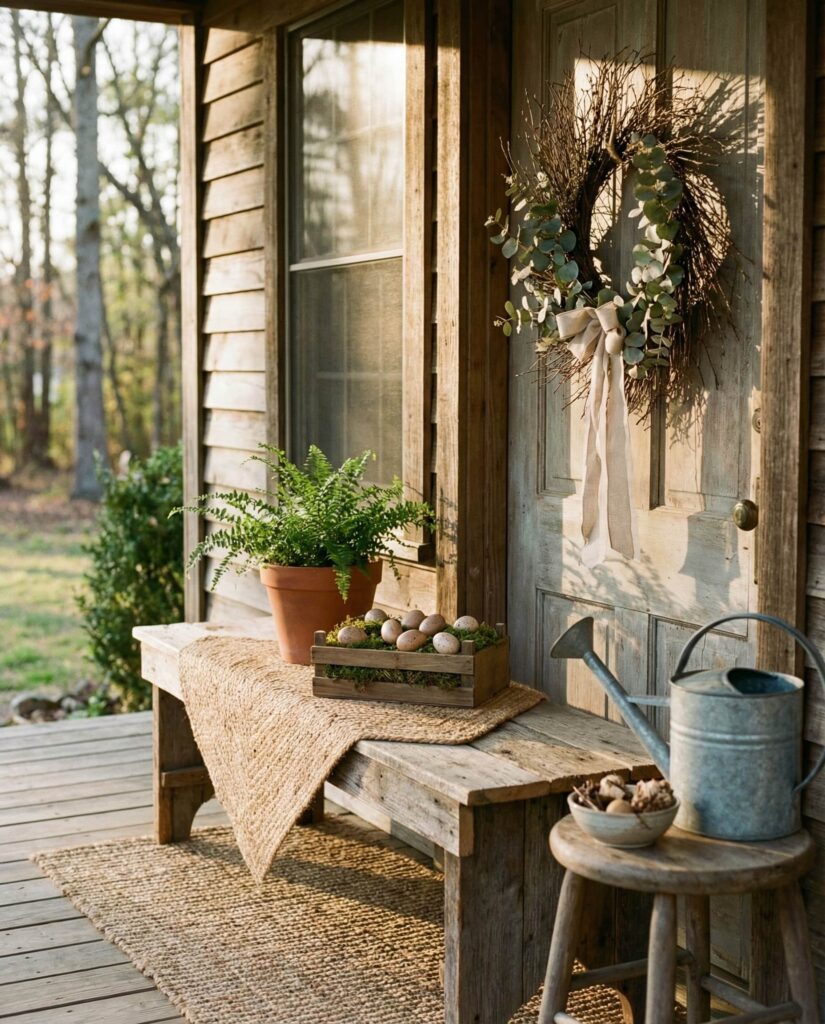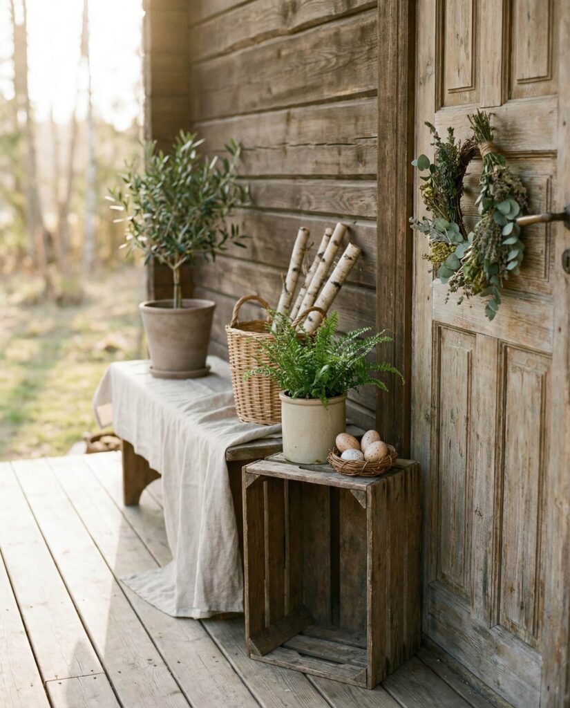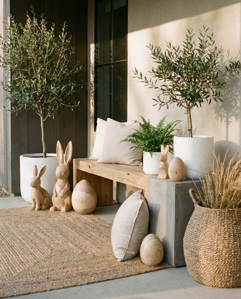 Wooden elements remain central to Simple Easter porch Ideas in 2026, especially for those drawn to organic design. Natural wood stools, benches, or hand-carved accents pair beautifully with greenery and seasonal blooms. This Outdoor springtime approach feels grounded and calming, echoing the shift toward sustainable decor choices. Editors from eco-conscious design blogs often emphasize wood’s ability to age gracefully, making it a smart investment. The result is a porch that feels honest, warm, and quietly festive.