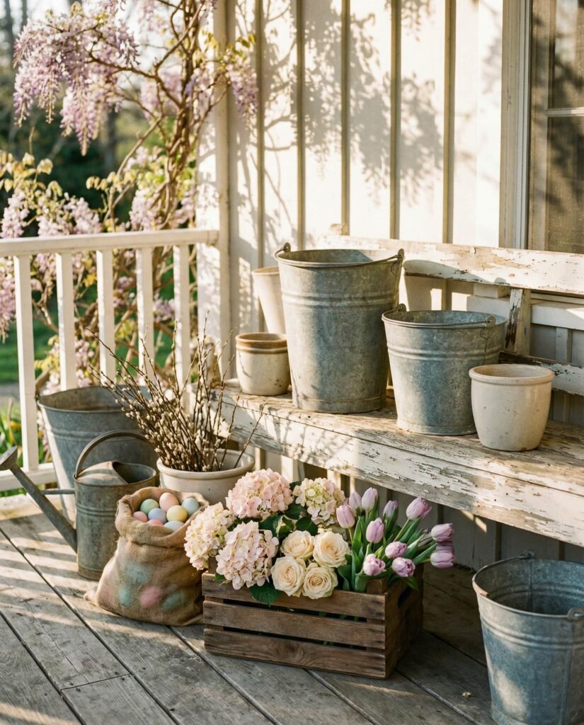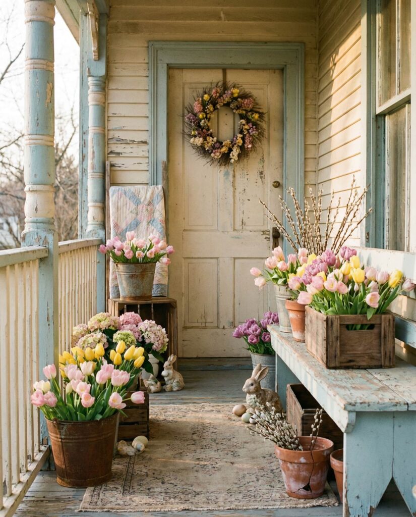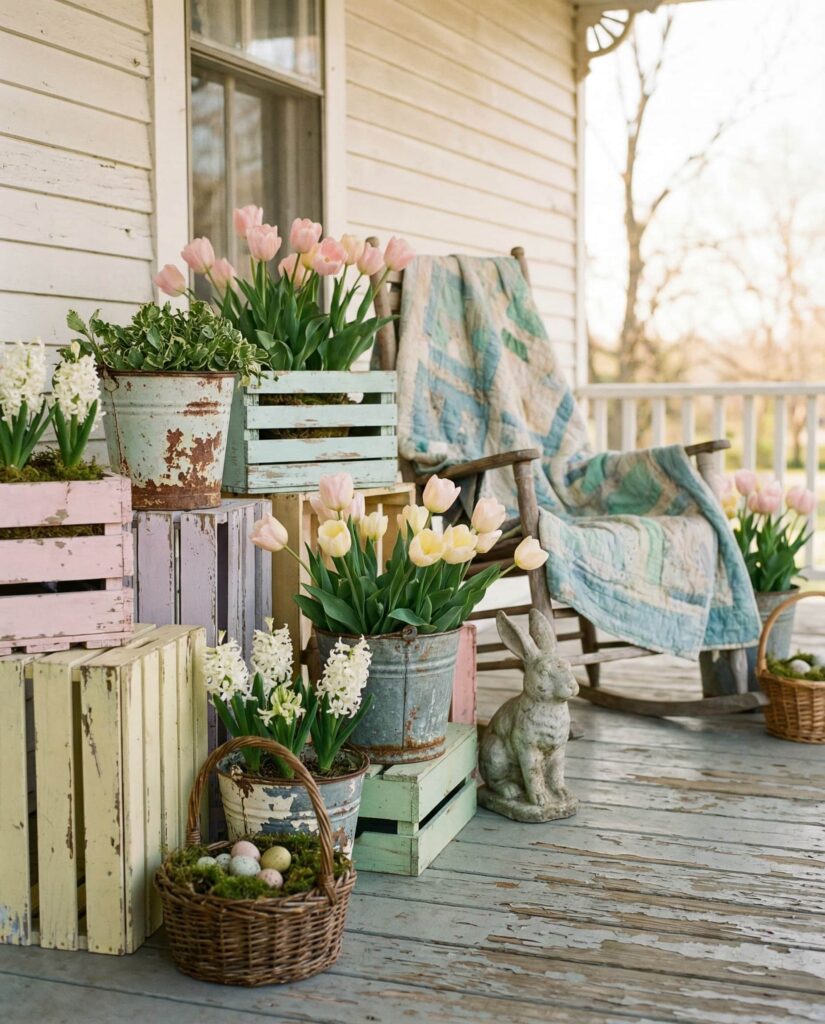 This Outdoor vintage Easter porch idea embraces gentle wear and faded color. In 2026, pastel tones with a slightly aged finish feel authentic rather than trendy. Vintage-style baskets, distressed containers, and timeworn textures create a sense of history. The look feels especially welcoming for older homes or cottages, aligning with trends discussed by vintage decor specialists who value character over perfection.