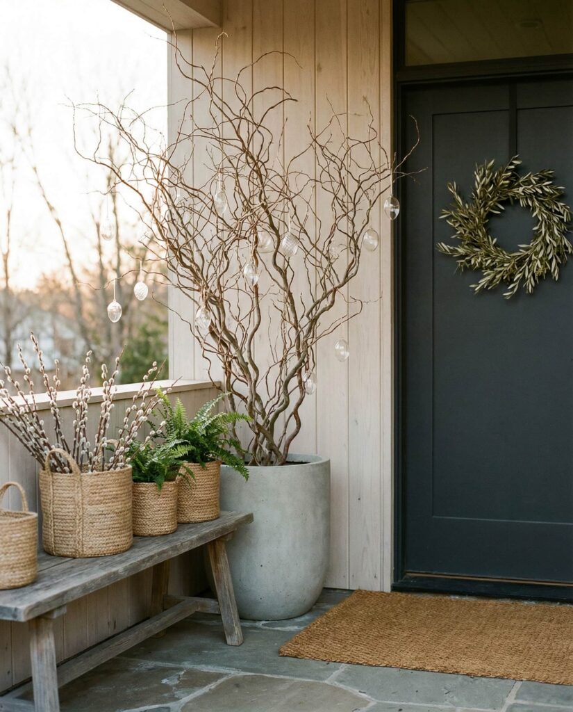 This Outdoor diy Easter porch idea for 2026 uses natural branches as a sculptural and seasonal statement. Instead of traditional decor overload, tall branches placed in Wooden or ceramic containers frame the entry and bring height to the space. Subtle Easter details like neutral hanging ornaments or soft ribbons keep the look Simple, Modern, and visually light. This approach fits well with Neutral and Classy homes, especially those that favor clean lines and intentional styling. Designers often note that branch installations add drama without clutter, making them a smart Easy solution for homeowners who want decorations diy that feel elevated, calm, and connected to Spring.