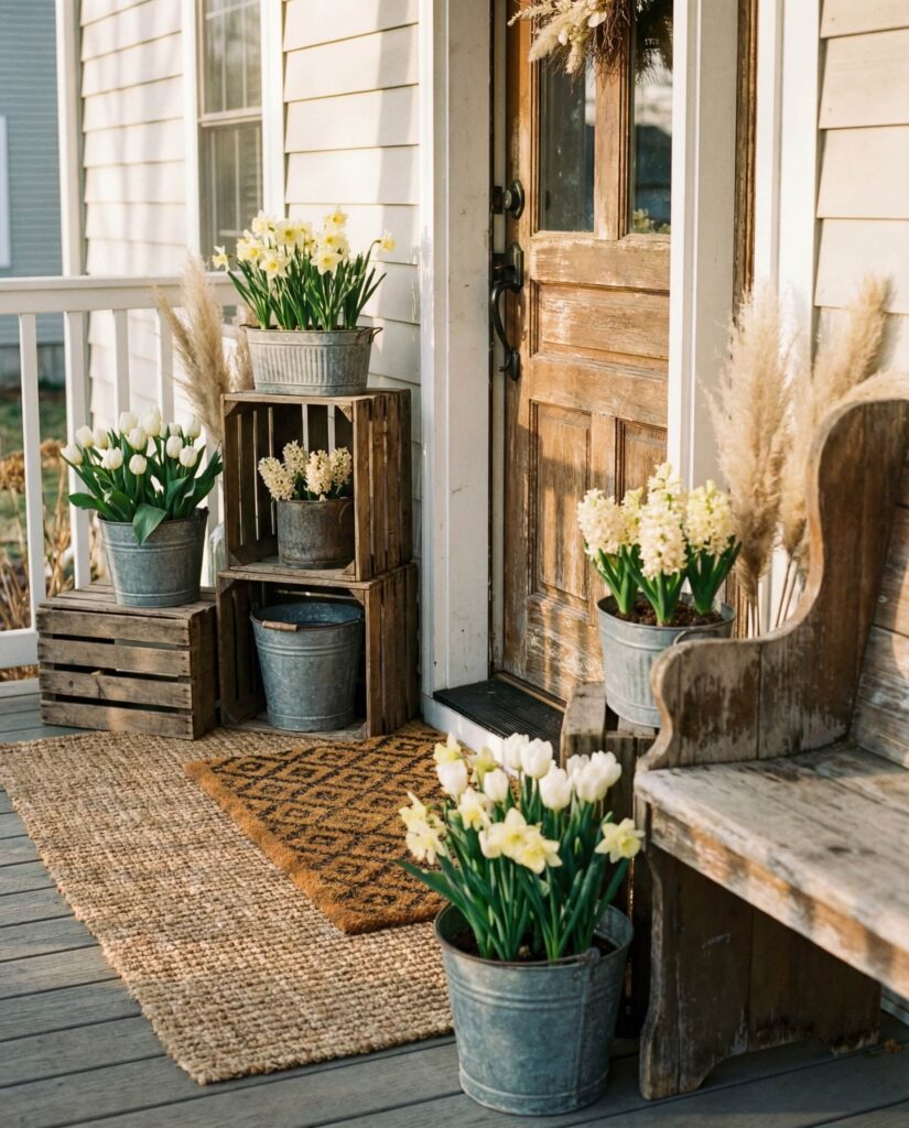 The Outdoor vintage porch tells a story through carefully chosen pieces that feel collected over time. In 2026, this style embraces soft patina, antique-style containers, and muted Spring florals to create a nostalgic yet refined mood. Old watering cans, enamel bowls, or faded baskets work as functional decor, adding warmth without feeling dated. This approach resonates with homeowners who appreciate history and craftsmanship, a sentiment often celebrated by vintage decor writers across lifestyle magazines. The look is Rustic, personal, and deeply inviting.