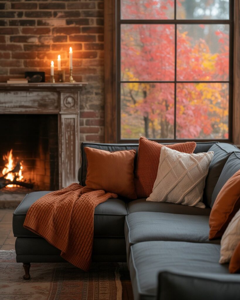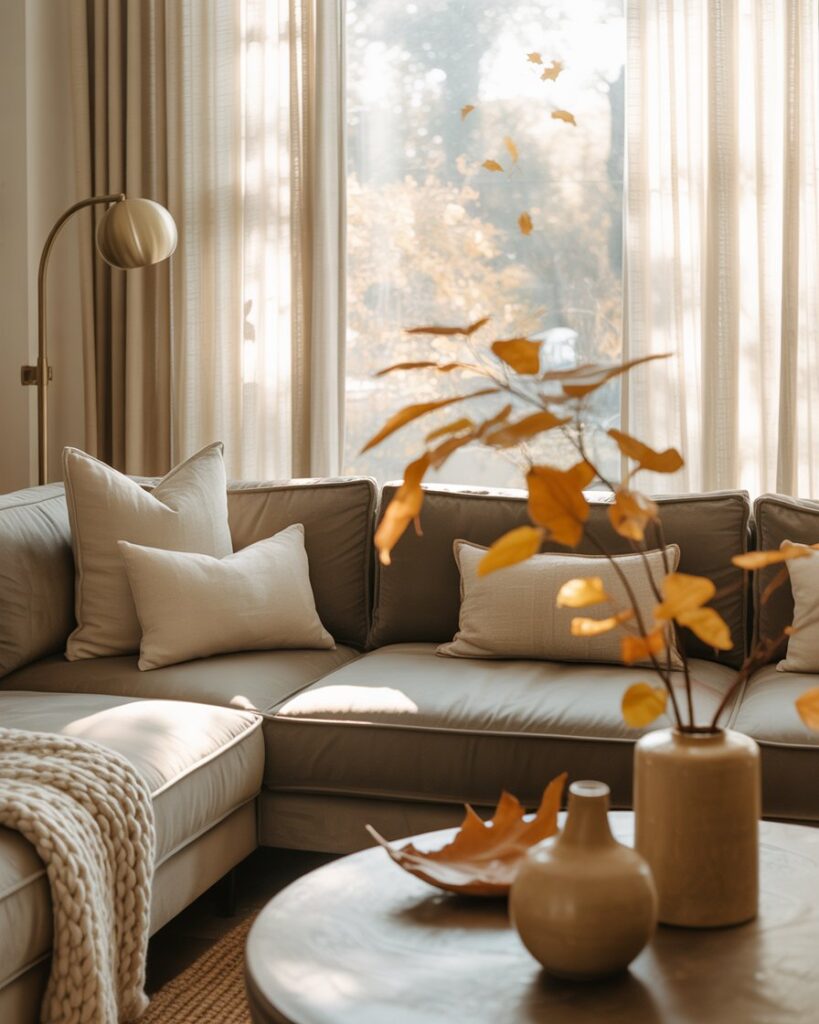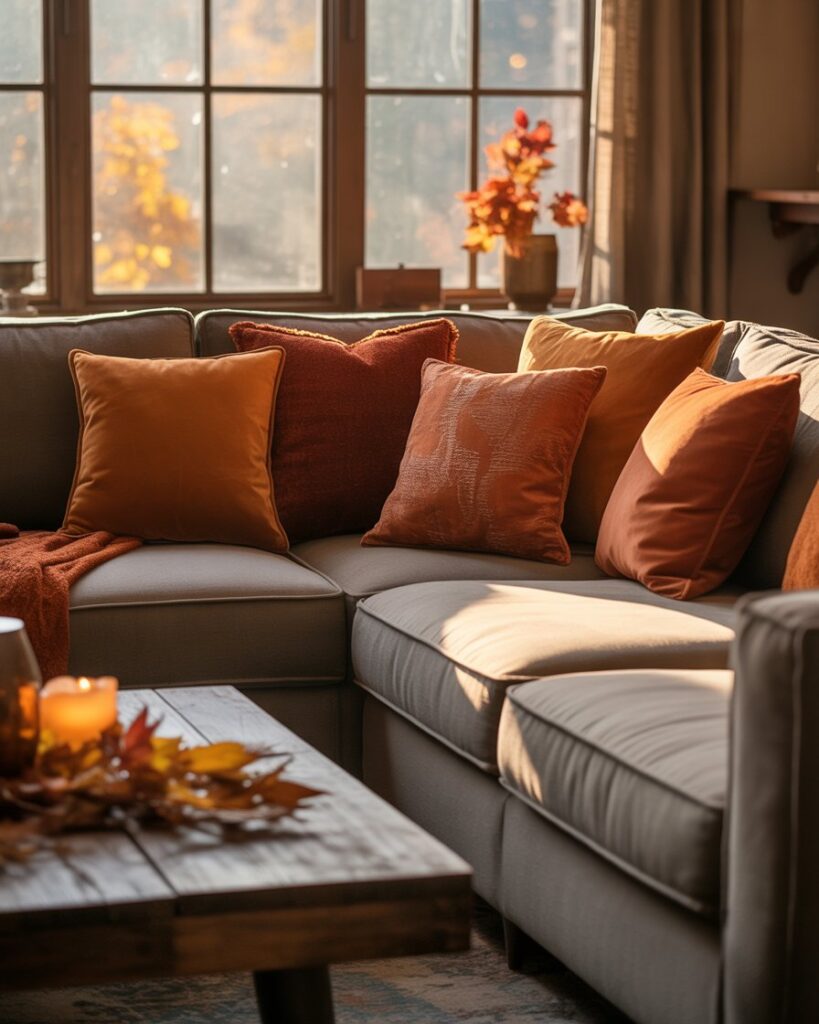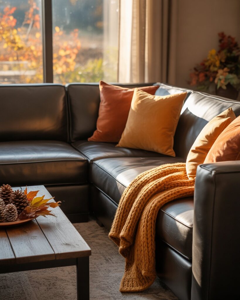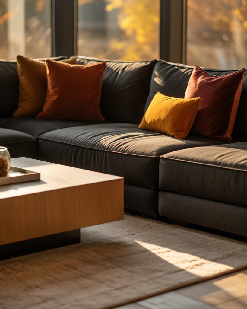 A neutral fall palette — cream, tan, taupe — brings peace and balance. Mix these tones with grey couch or with black couch, adding warm colors through accents like terracotta vases or golden throws. This look feels calm yet sophisticated, perfect for mindful interiors.