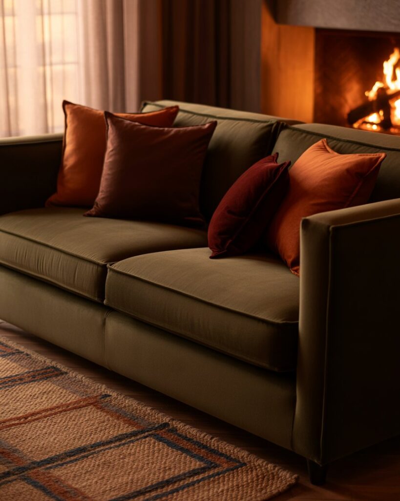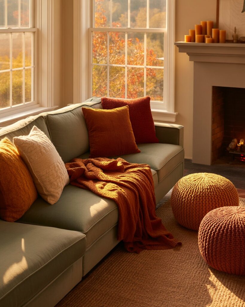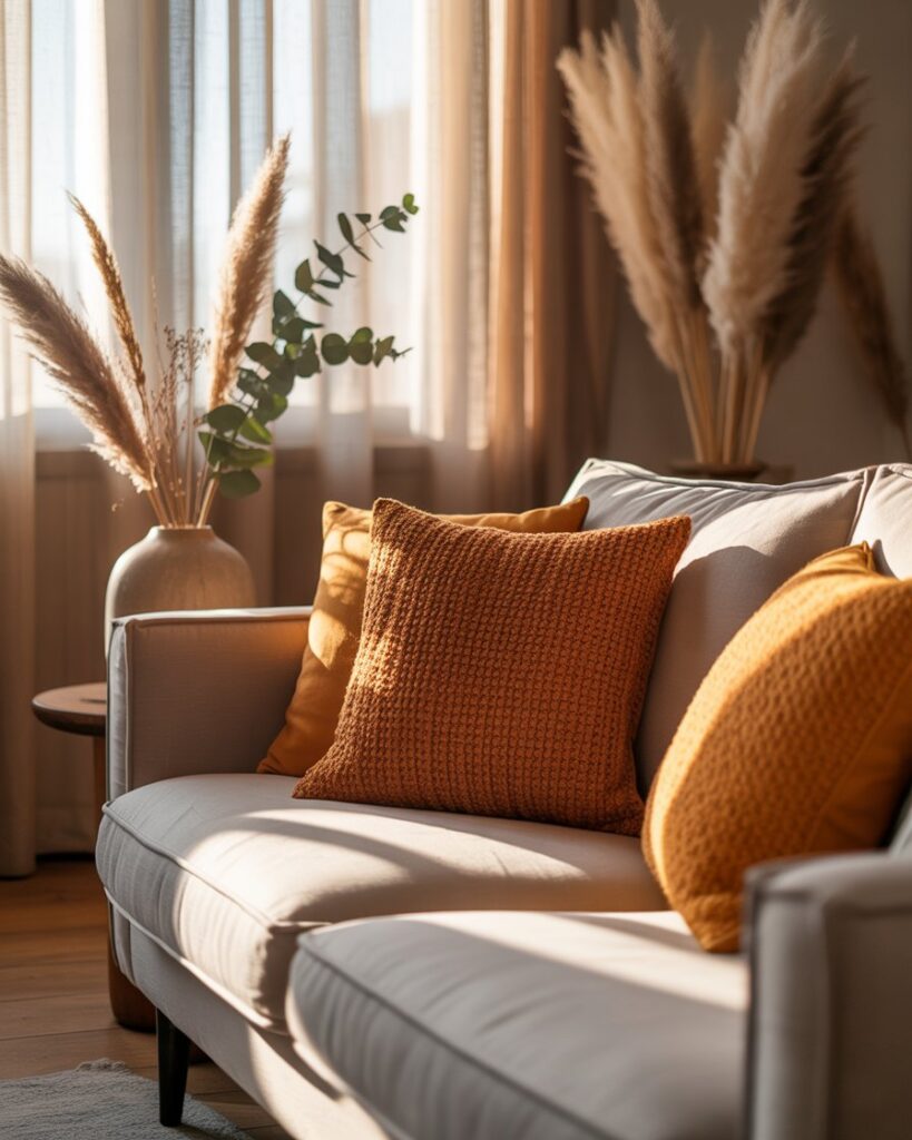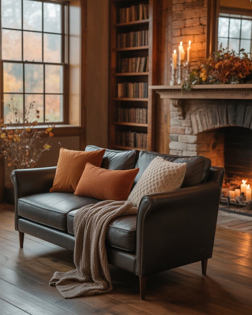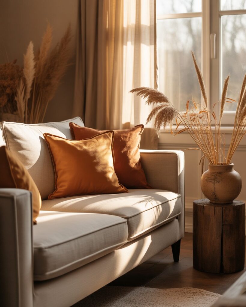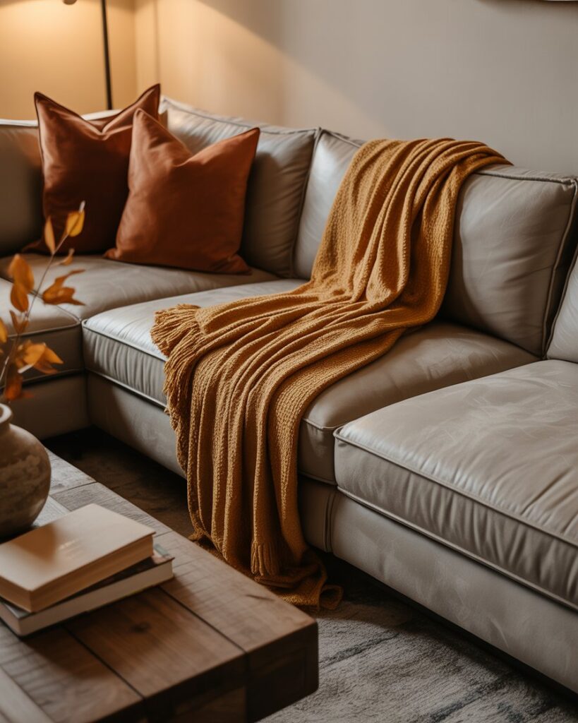 A neutral fall palette — cream, tan, taupe — brings peace and balance. Mix these tones with grey couch or with black couch, adding warm colors through accents like terracotta vases or golden throws. This look feels calm yet sophisticated, perfect for mindful interiors.