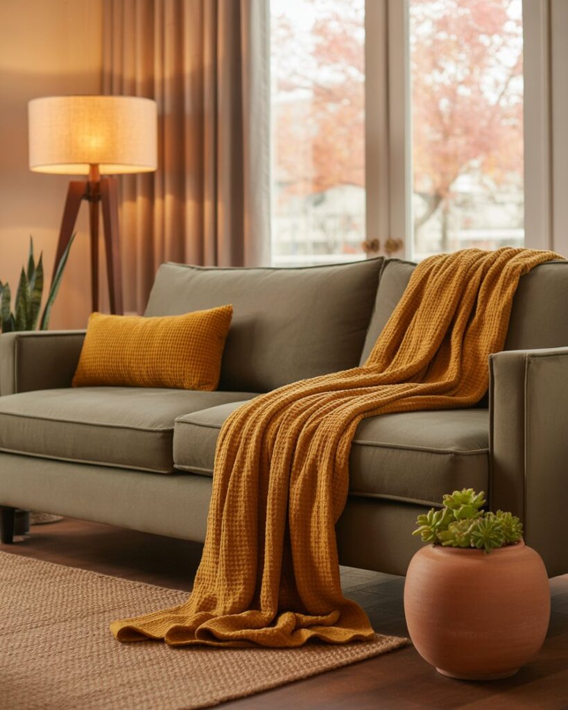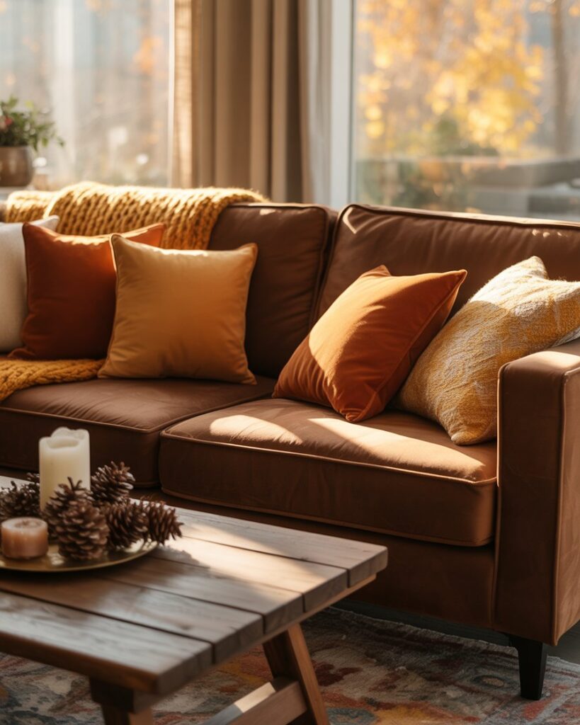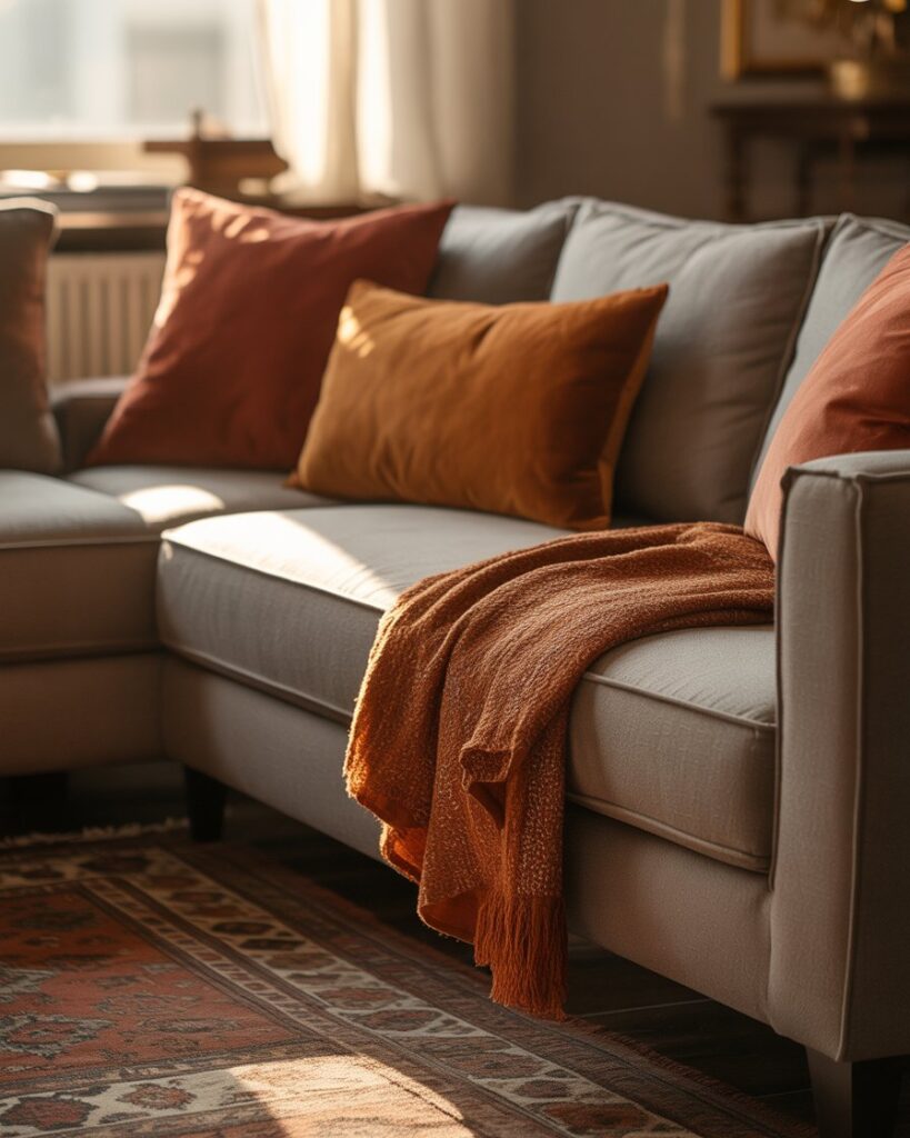Sometimes, simple changes make the biggest difference. Add warm colors decorative pillows and textured throws to a gray couch or brown couch for instant transformation. Mix patterns carefully — checks, knits, and faux fur bring life to neutral spaces while staying aesthetic and inviting.