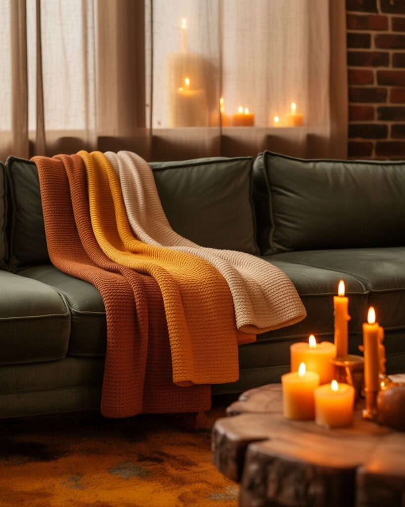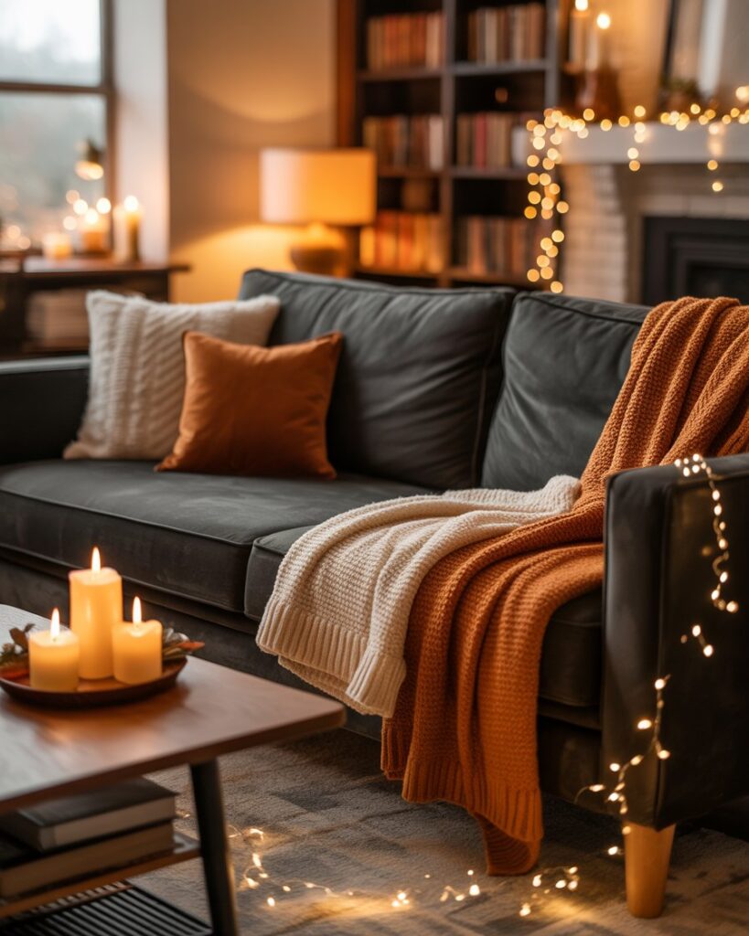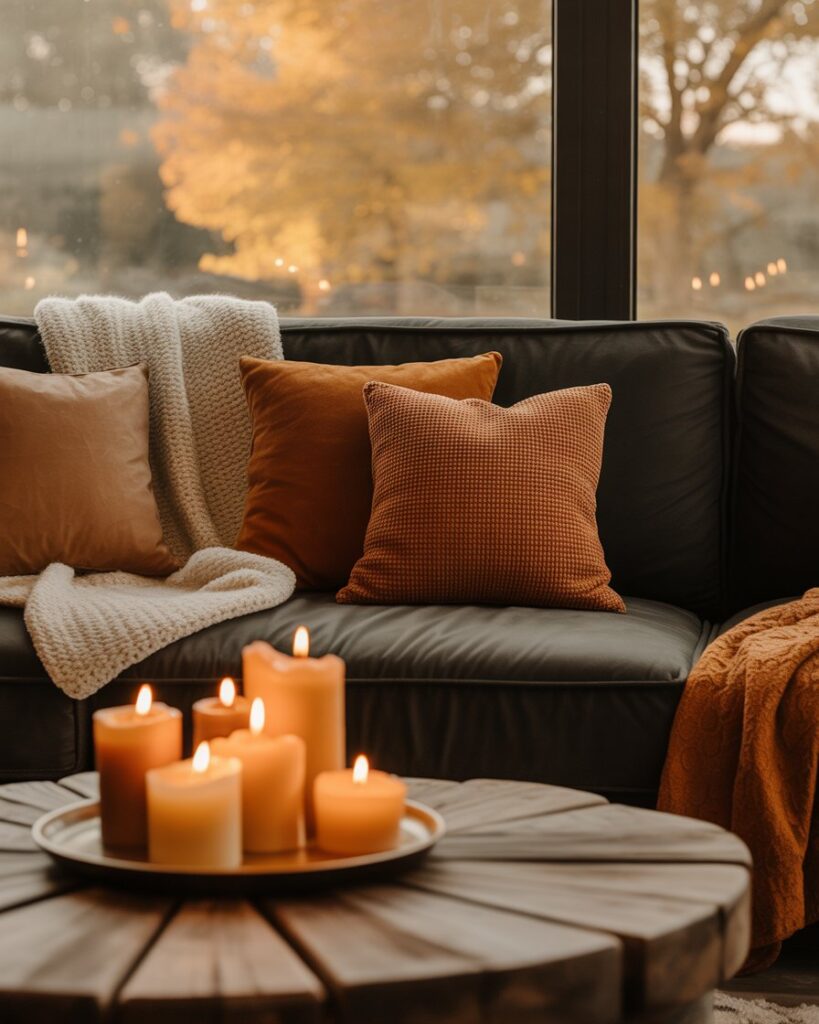 Set the mood through scent as much as sight. Cinnamon, clove, or amber candles create a multisensory cozy experience. Pair warm colors autumn decor with grey couch or with black couch for an intimate evening glow. The result feels both nostalgic and new.
