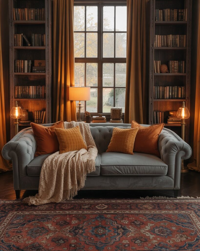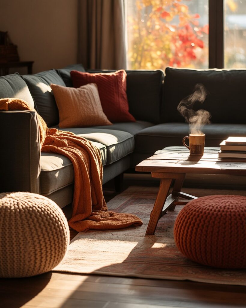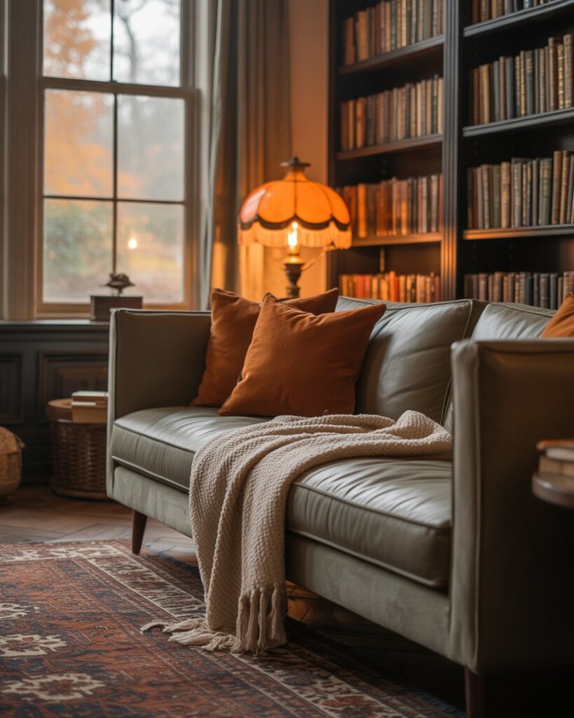 Create an autumn cozy reading nook by combining warm colors and layered textiles. Place a small armchair or gray couch near the window, add a throw, and a side lamp with amber light. A soft rug and bookshelf turn a quiet corner into a sanctuary perfect for chilly evenings with tea and a good book.