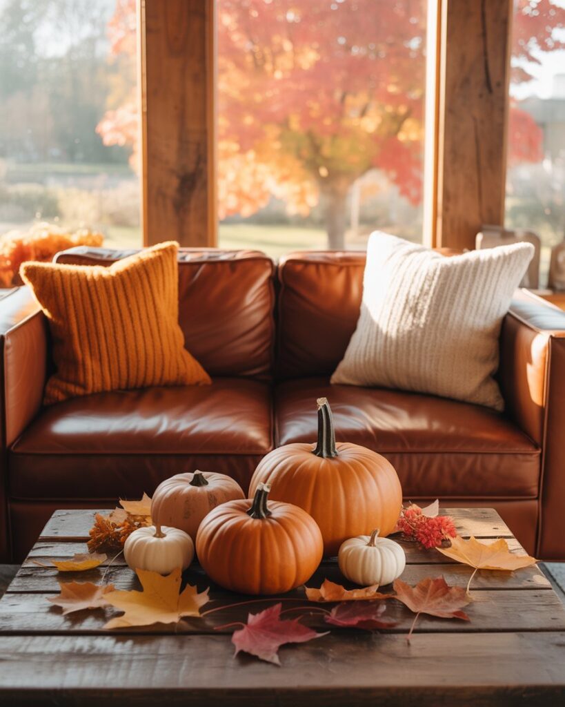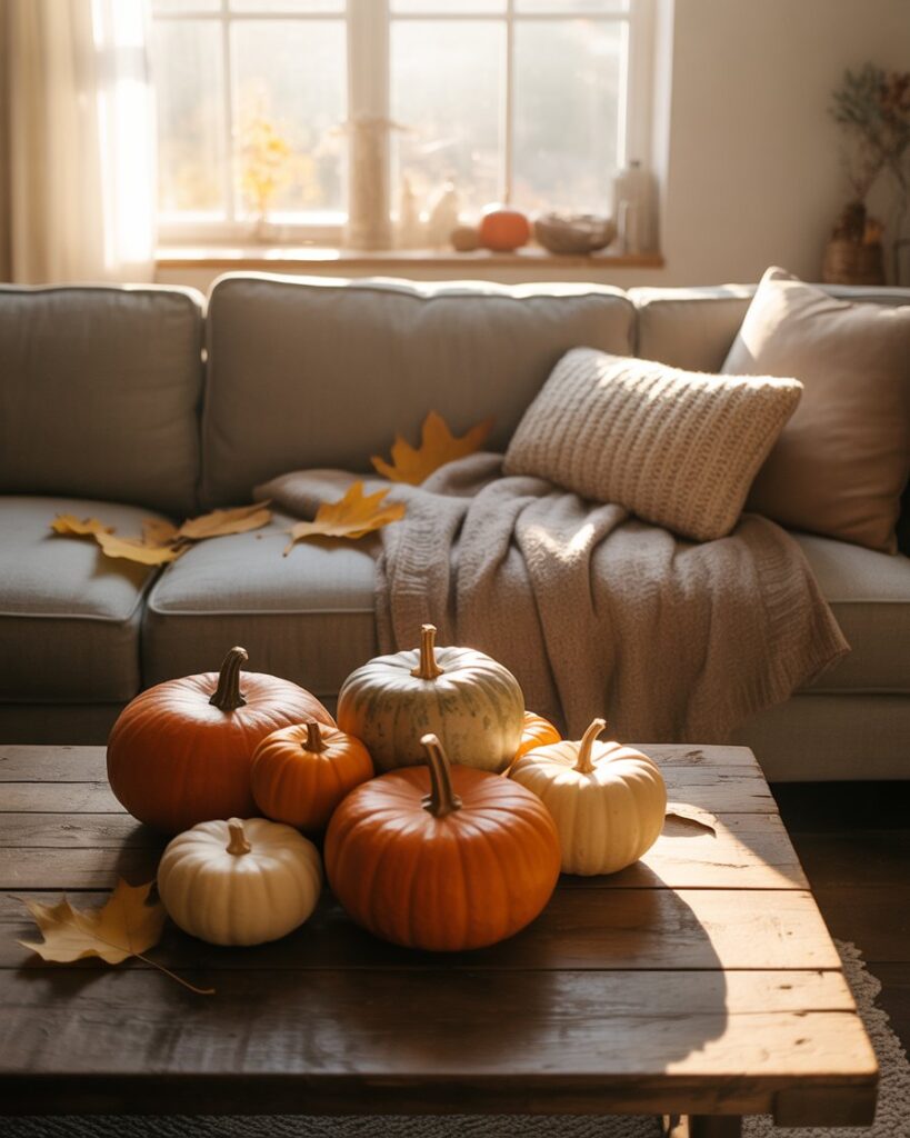Bring the outdoors in by decorating with pumpkins, branches, and dried leaves — a perfect simple autumn touch. These natural elements pair beautifully with grey couch or brown couch, adding an organic charm. Interior stylist Justina Blakeney often recommends greenery to breathe seasonal life into small spaces.