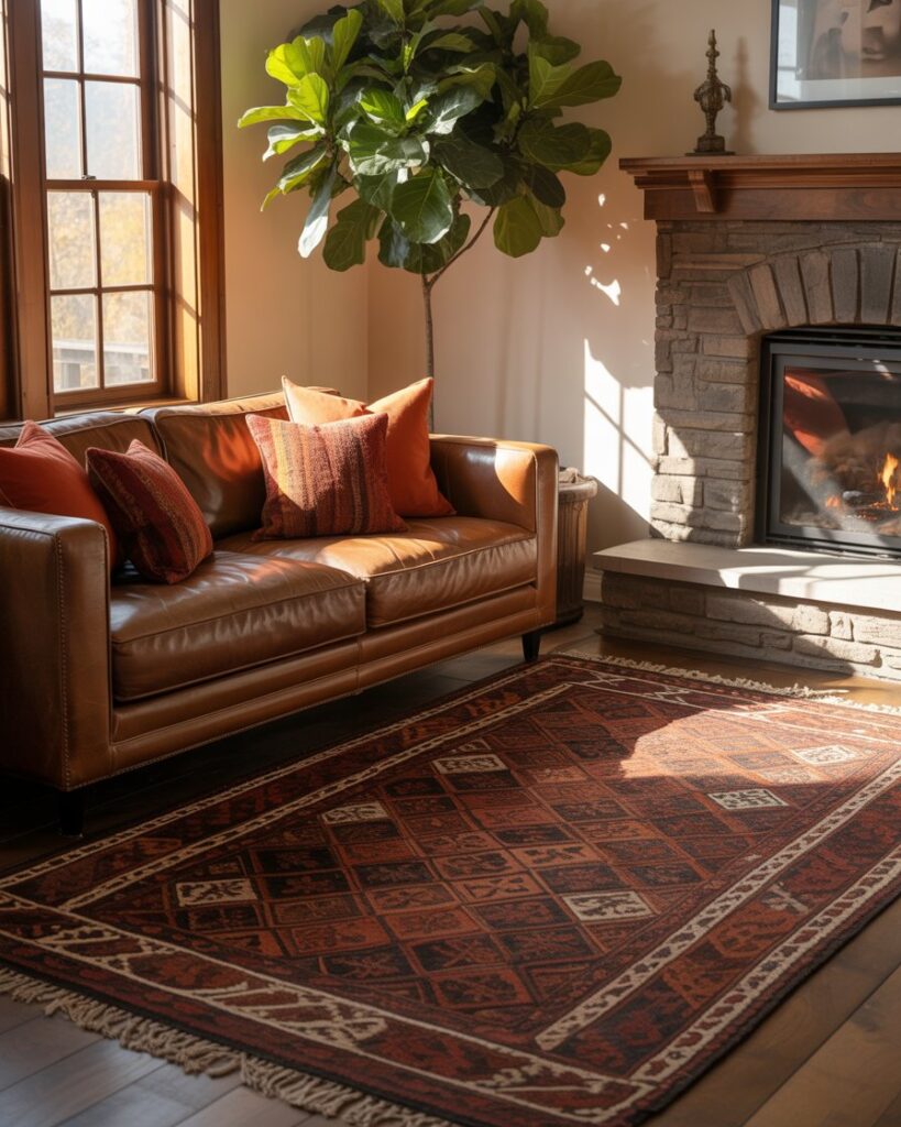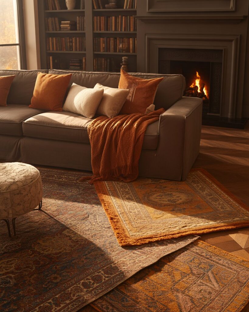 Stacking rugs in contrasting textures — jute beneath wool, for instance — adds depth and tactile warmth. This trend works beautifully with grey couch or brown couch in both rustic farmhouse and contemporary spaces. Choose warm colors for added richness and dimension underfoot.