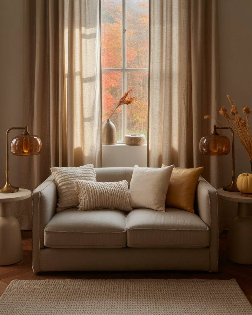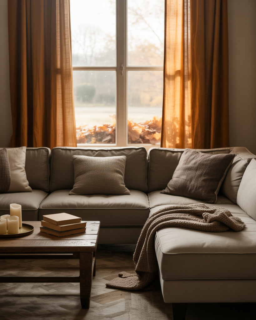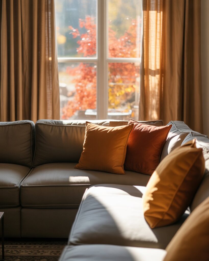 Changing your curtains can completely transform the mood. Opt for thick, linen drapes in warm colors like burnt sienna or ochre. They frame your gray couch beautifully and add that cozy fall softness every apartment needs as days grow shorter.