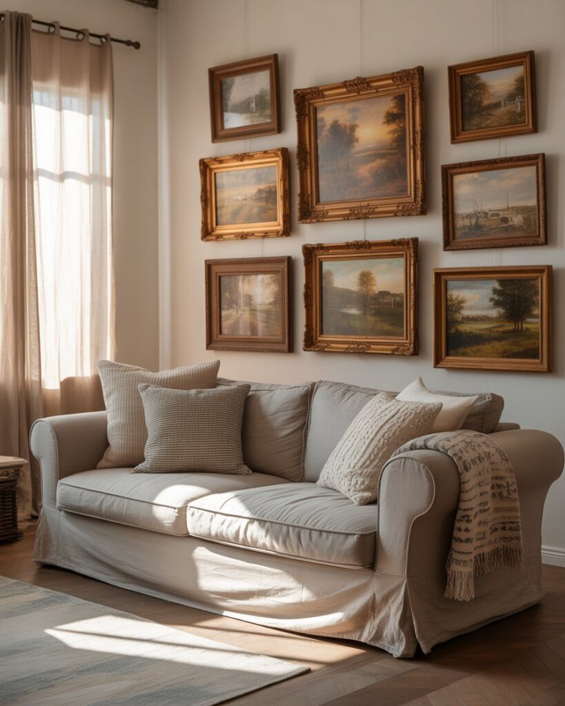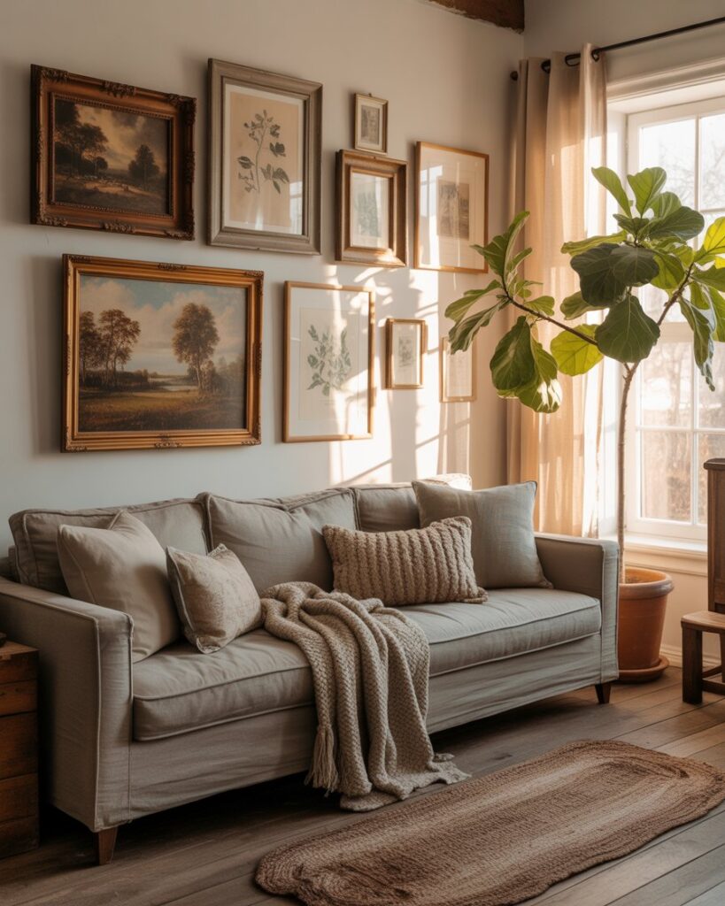 Transform blank walls into a rustic farmhouse statement by adding framed prints of autumn landscapes, pressed leaves, or family photos in wood frames. A brown couch or grey couch anchors the scene while layered textures make the space feel warm colors cozy and lived-in.