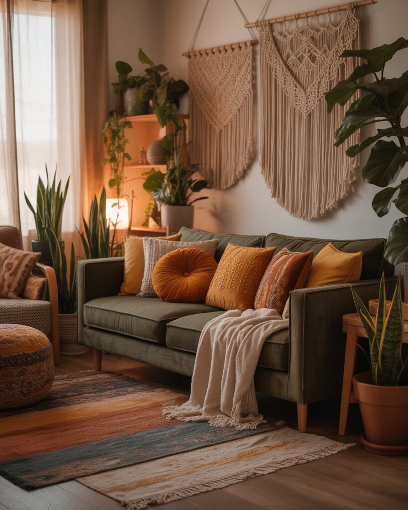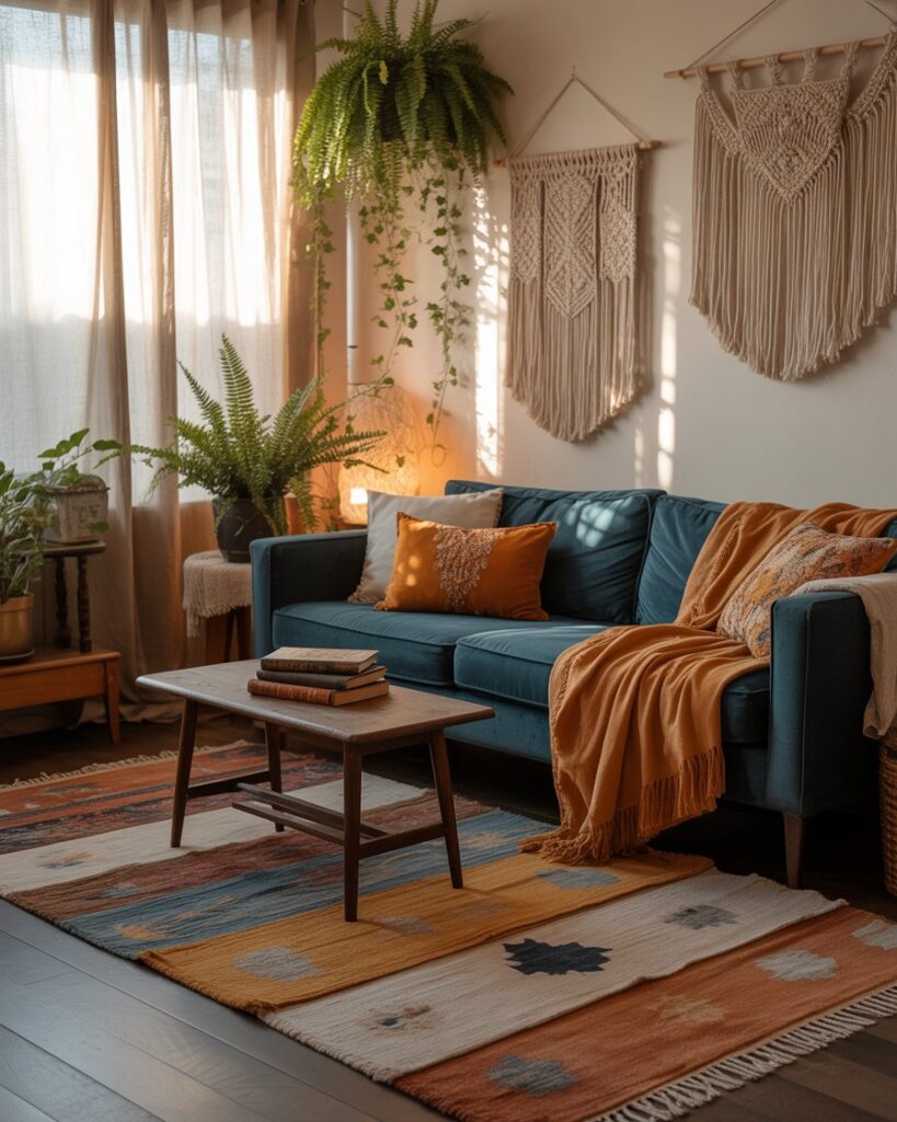 Combine moody tones and boho charm for an eclectic fall retreat. Use warm colors with a blue couch or dark grey couch, layered with macramé, patterned rugs, and plants. The look is soulful, unpretentious, and perfect for apartment living.