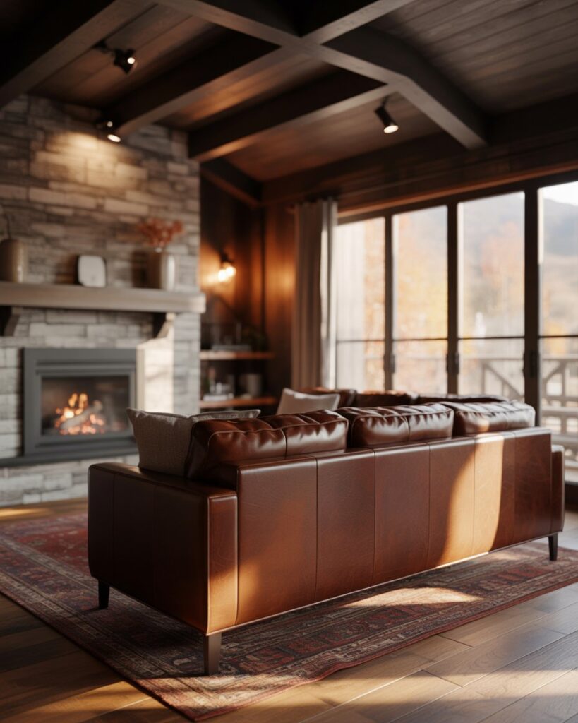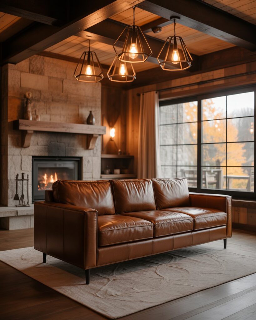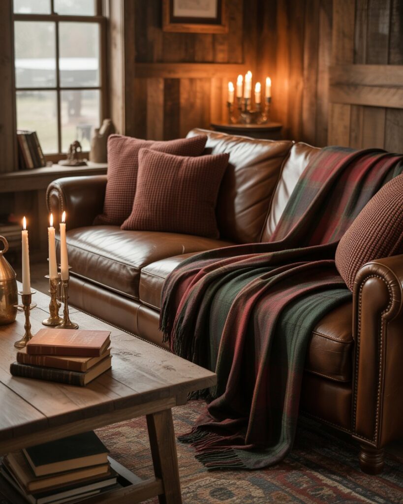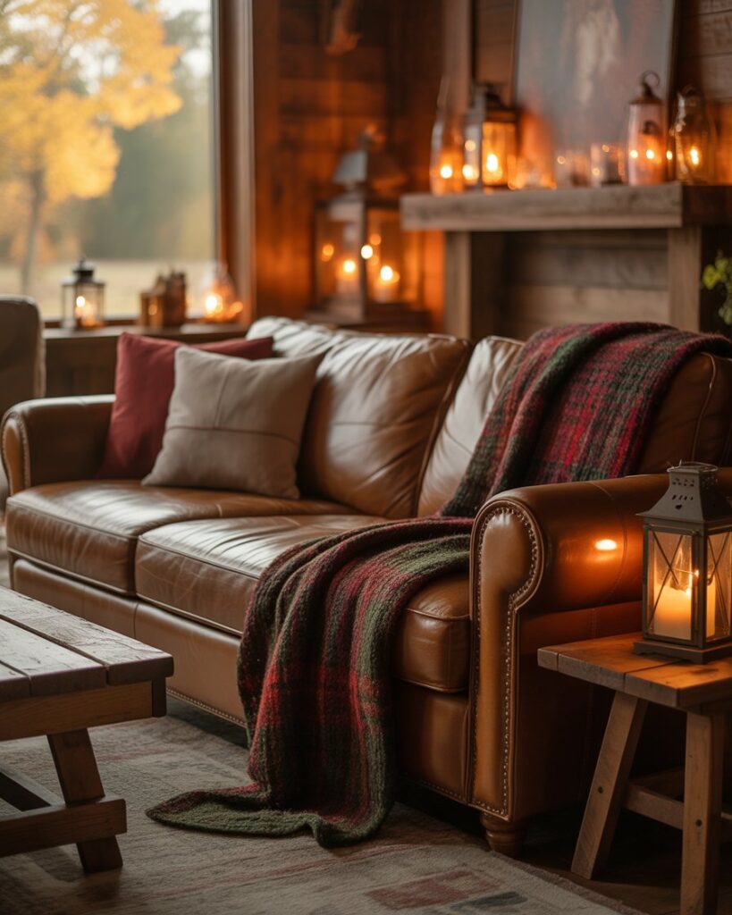The rustic farmhouse look remains a timeless choice for autumn interiors. Natural woods, iron details, and wool textiles form a balance of simple beauty and warmth. A brown couch or dark grey couch feels perfectly at home here, surrounded by woven baskets and plaid blankets. Joanna Gaines popularized this inviting, family-centered approach to design that feels both nostalgic and fresh.
