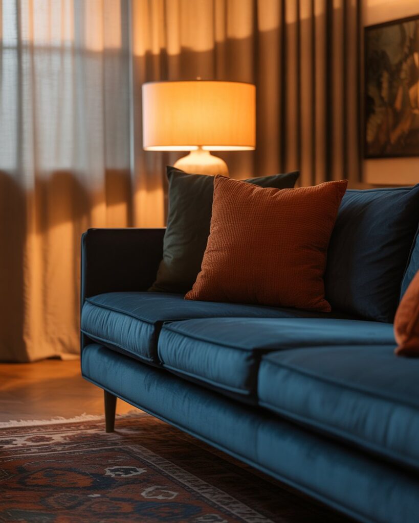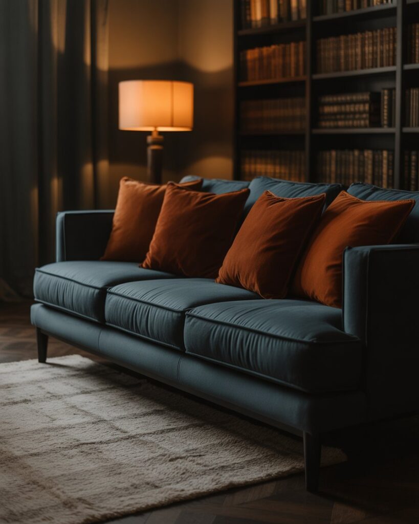 The moody aesthetic celebrates the richness of fall evenings — think deep olive, navy, and burnt orange. These tones look stunning with black couch or blue couch, creating dramatic warmth. Pair with velvet pillows and vintage gold frames for a romantic yet grounded space that glows in the lamplight.