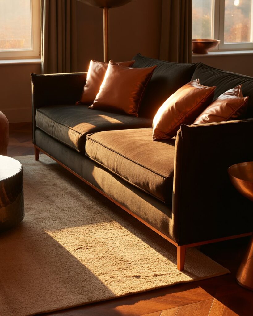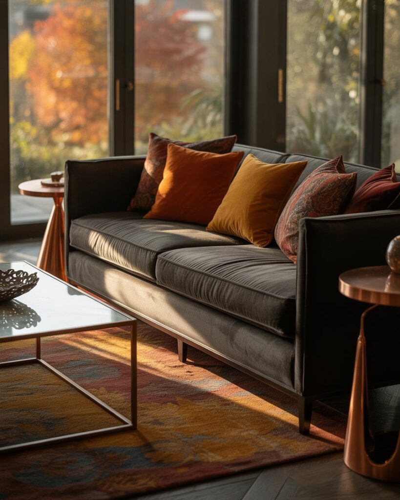 A dark grey couch feels sleek and timeless — ideal for those seeking understated luxury. Complement it with copper tones, warm colors autumn accessories, and textured rugs. This creates a moody sophistication that’s equally cozy and elevated. Interior expert Nate Berkus calls dark neutrals “the unsung heroes of comfort.”