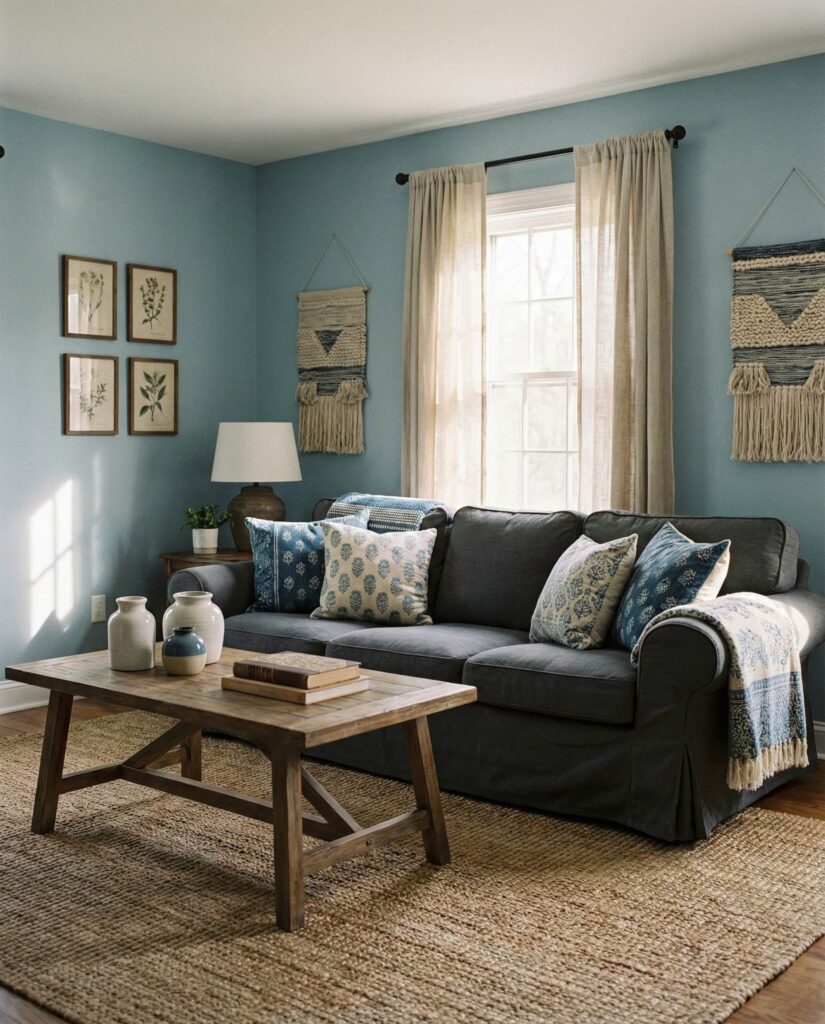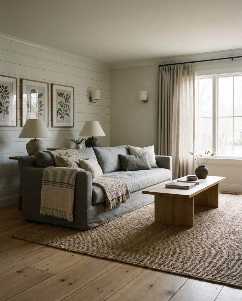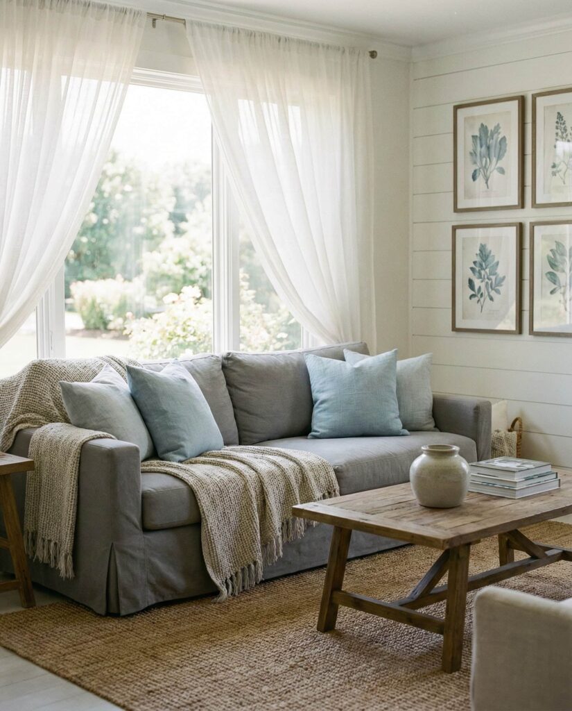 The Coastal farmhouse living room borrows the farmhouse structure but lightens the mood. Soft Blue, sandy neutrals, and breathable Curtains make spaces feel open and relaxed, even far from the ocean. This style works well in smaller homes where natural light is precious. A slipcovered Gray couch, woven textures, and understated Wall decor keep the room from feeling themed. I’ve noticed homeowners drawn to this look after spending more time at home—it offers visual rest. Designers often recommend it as a bridge between traditional farmhouse and casual contemporary living.