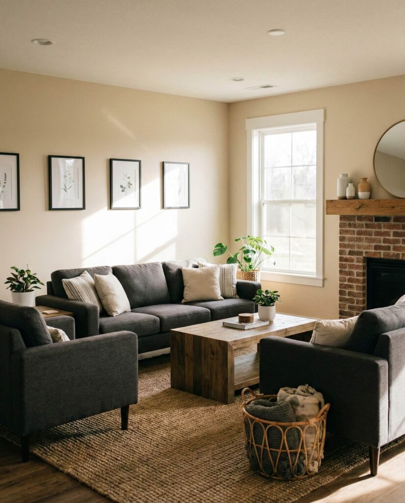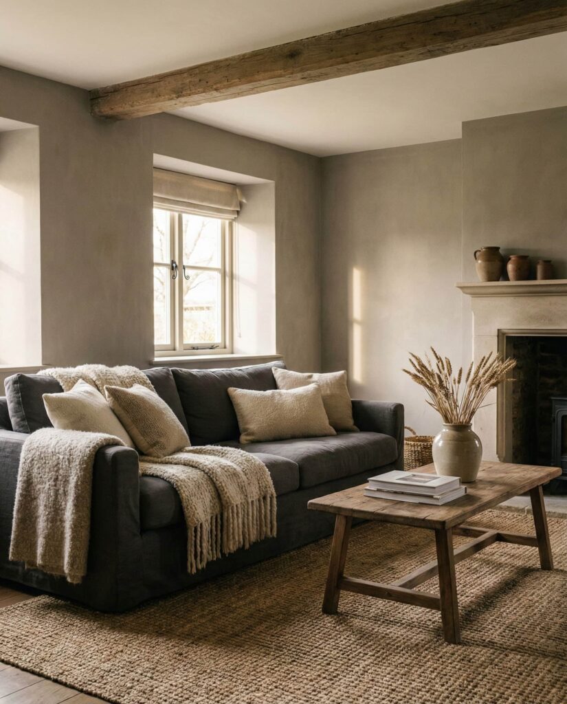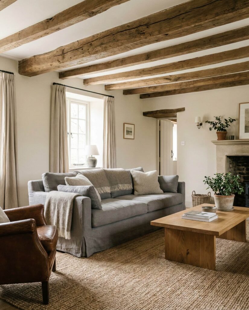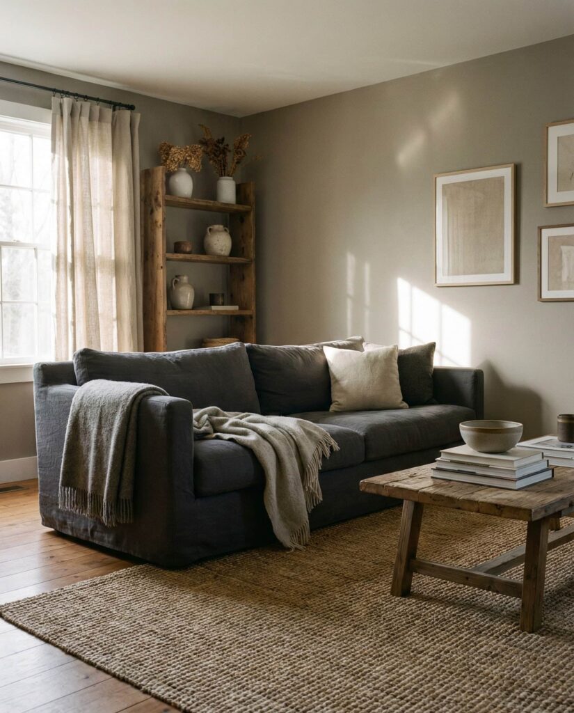 This farmhouse living room idea leans fully into Earthy neutrals—sand, clay, warm Grey, and soft taupe. These colors create a grounding atmosphere that feels both current and timeless. The palette pairs well with simple Furniture, understated decor ideas, and tactile materials. A Gray couch, woven Curtains, and natural fiber Rug add comfort without visual clutter. This style is especially appealing to homeowners seeking calm after busy days. It’s farmhouse reduced to its most comforting elements.