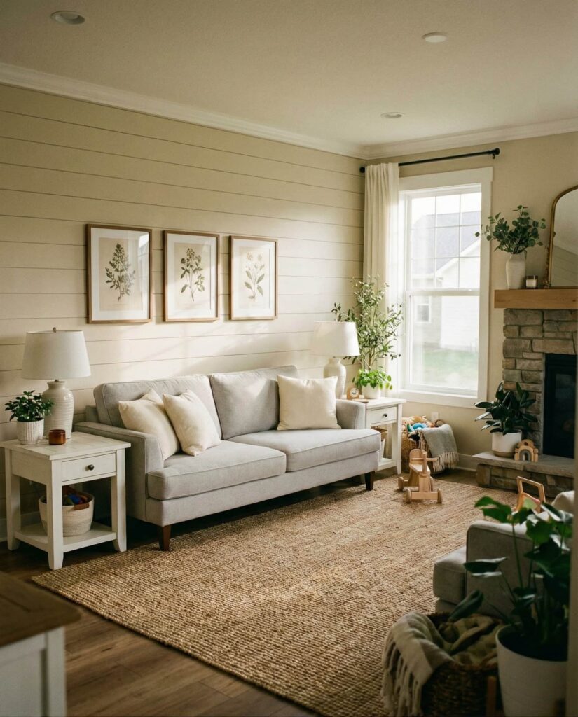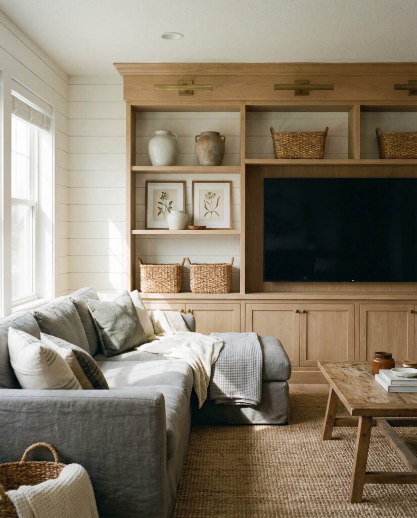 This idea focuses on integrating built-in Furniture to create a farmhouse living room that feels organized, intentional, and effortlessly cozy. Custom shelving, window seats, and low-profile cabinets help reduce visual clutter while enhancing daily comfort. Finished in soft Paint colors like warm Grey, creamy white, or muted Green, built-ins blend seamlessly with a Modern farmhouse layout. A Gray couch, natural wood accents, and restrained Wall decor keep the space approachable rather than formal. I’ve noticed homeowners increasingly value this approach, especially families who want style without sacrificing function. When paired with a textured Rug and layered Lighting, built-in elements elevate the room while supporting real-life living and adaptable decor ideas.