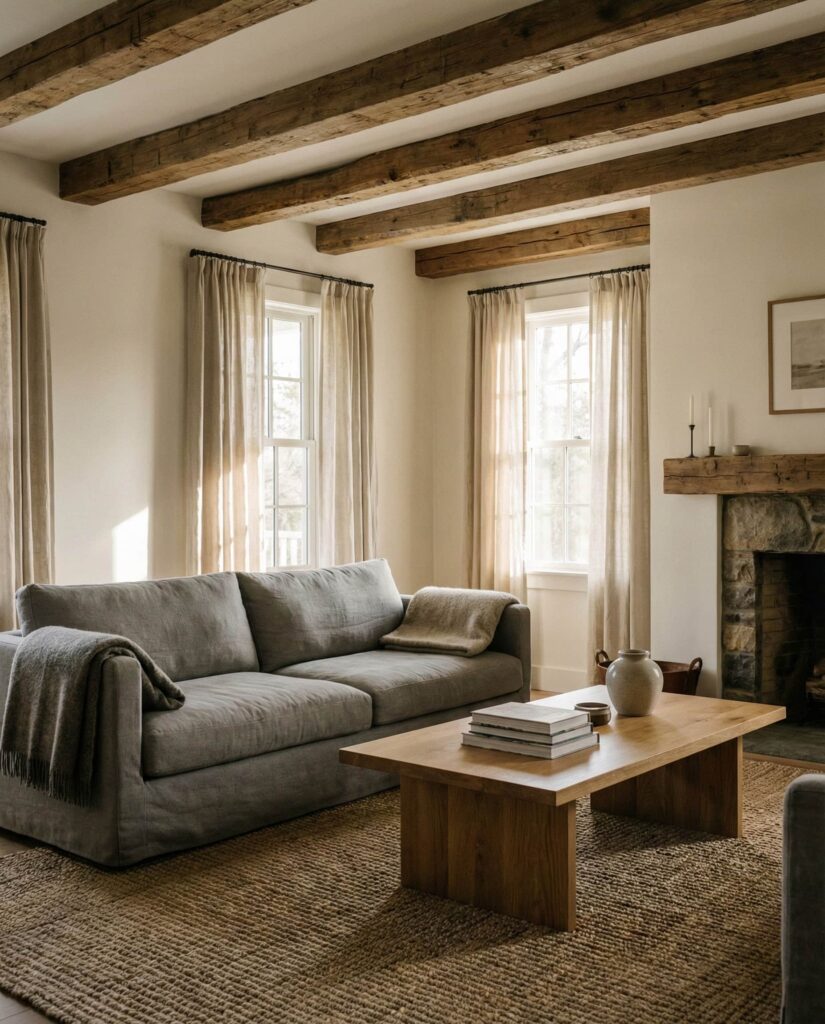 This idea centers on celebrating natural wood as the emotional anchor of the farmhouse living room. Exposed ceiling beams, oak coffee tables, and softly finished wood Furniture bring instant warmth while keeping the space grounded and authentic. Paired with Modern layouts, neutral Paint colors, and a comfortable Gray couch, the room feels balanced rather than rustic. This approach works beautifully in both suburban homes and renovated farmhouses, especially for homeowners who want a cozy yet practical environment. Adding subtle Wall decor, linen Curtains, and a textured Rug helps soften the look. The natural grain creates an Earthy presence that feels timeless, sustainable, and deeply connected to the farmhouse spirit without relying on heavy ornamentation.