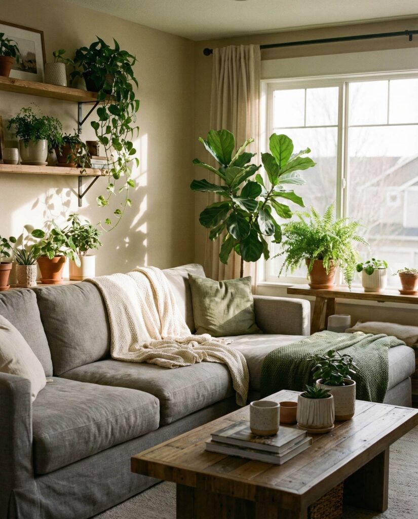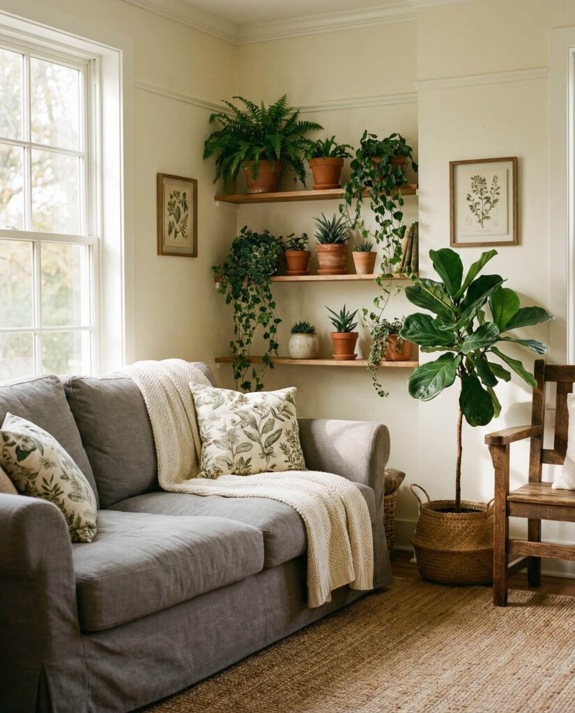 A farmhouse living room layered with Green botanical elements feels refreshing and restorative. This idea uses plants as living decor ideas, blending them with Modern and Vintage touches for visual depth. Olive-toned Paint colors, potted trees, and subtle leaf-patterned textiles pair naturally with farmhouse Furniture and a neutral Gray couch. This style works especially well in homes craving a connection to nature without leaning Coastal. Natural light, simple Wall decor, and breathable Curtains keep the space from feeling crowded. The result is a cozy, healthy-feeling room that reflects current design conversations about wellness, sustainability, and comfort-driven designs.