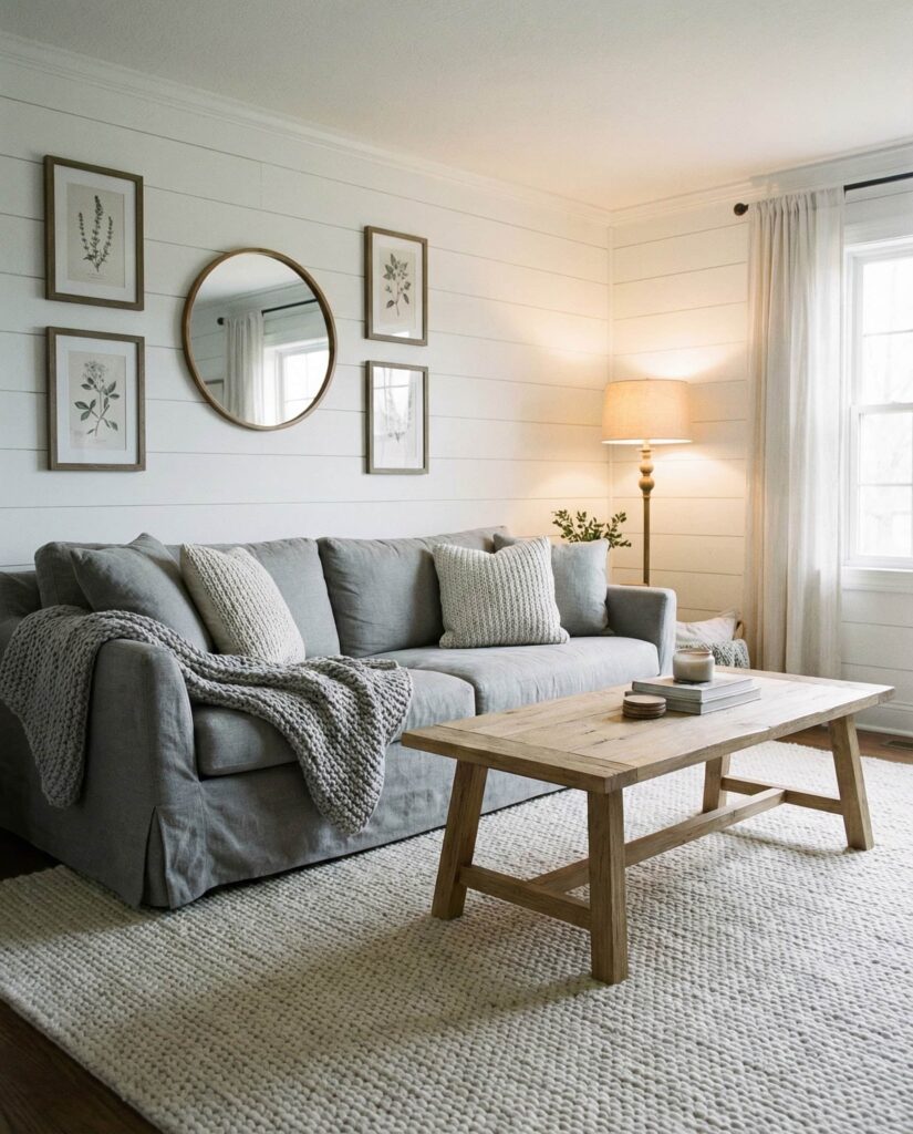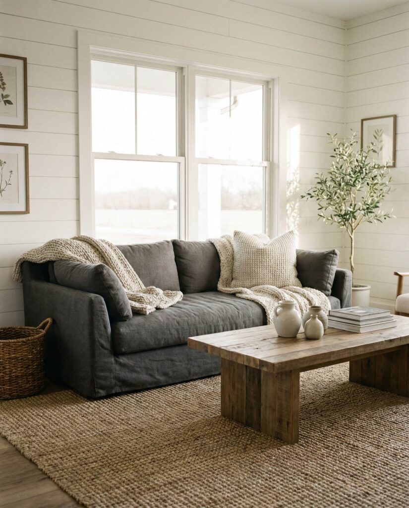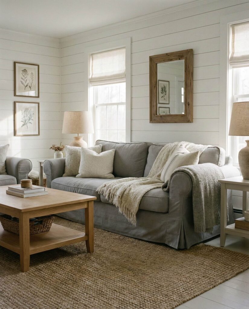 13. Farmhouse Living Room with Soft Grey and White Harmony