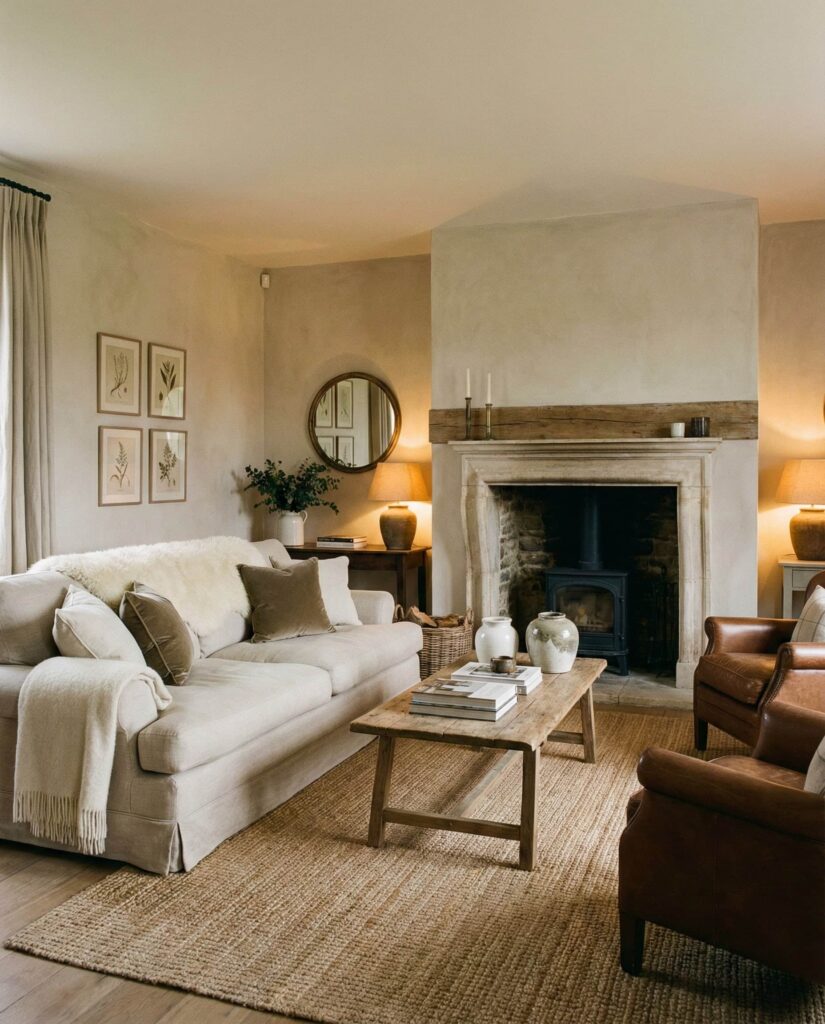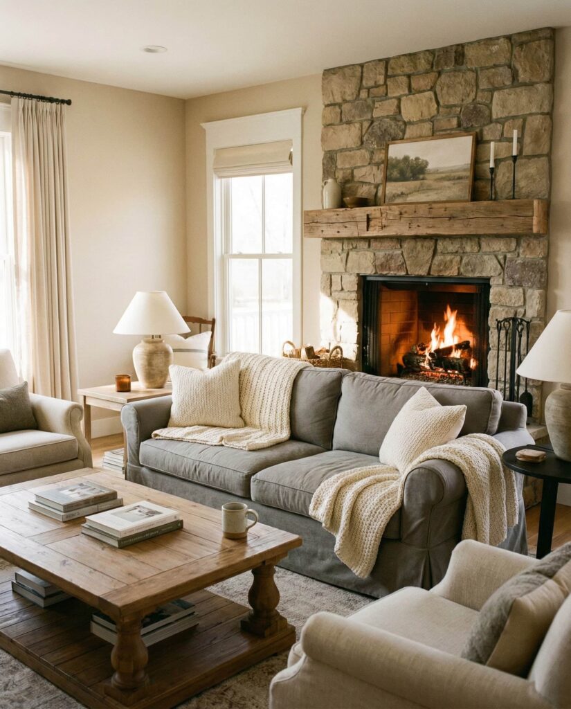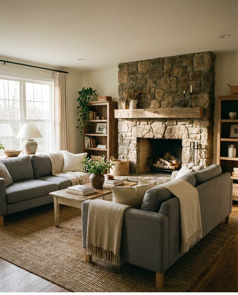 The Fireplace is reclaiming its role as the emotional center of the farmhouse living room. Whether stone, brick, or plaster, a statement fireplace anchors seating and shapes the room’s layout. Neutral colors, comfortable Furniture, and understated Wall decor allow the fireplace to stand out without feeling dominant. This idea works in both Small cozy homes and larger open spaces. I’ve noticed that homeowners naturally gather around the fireplace, making it as social as it is visual. Paired with warm Lighting and a soft Rug, it reinforces the farmhouse promise of comfort and togetherness.