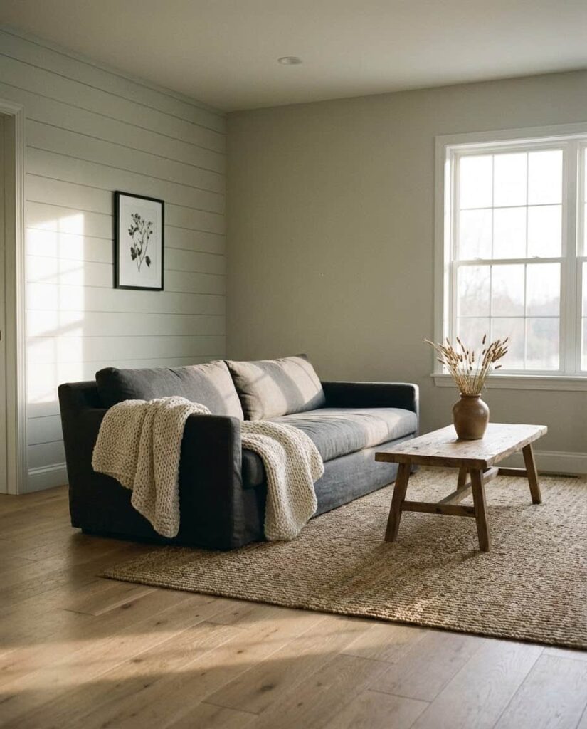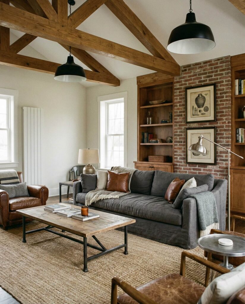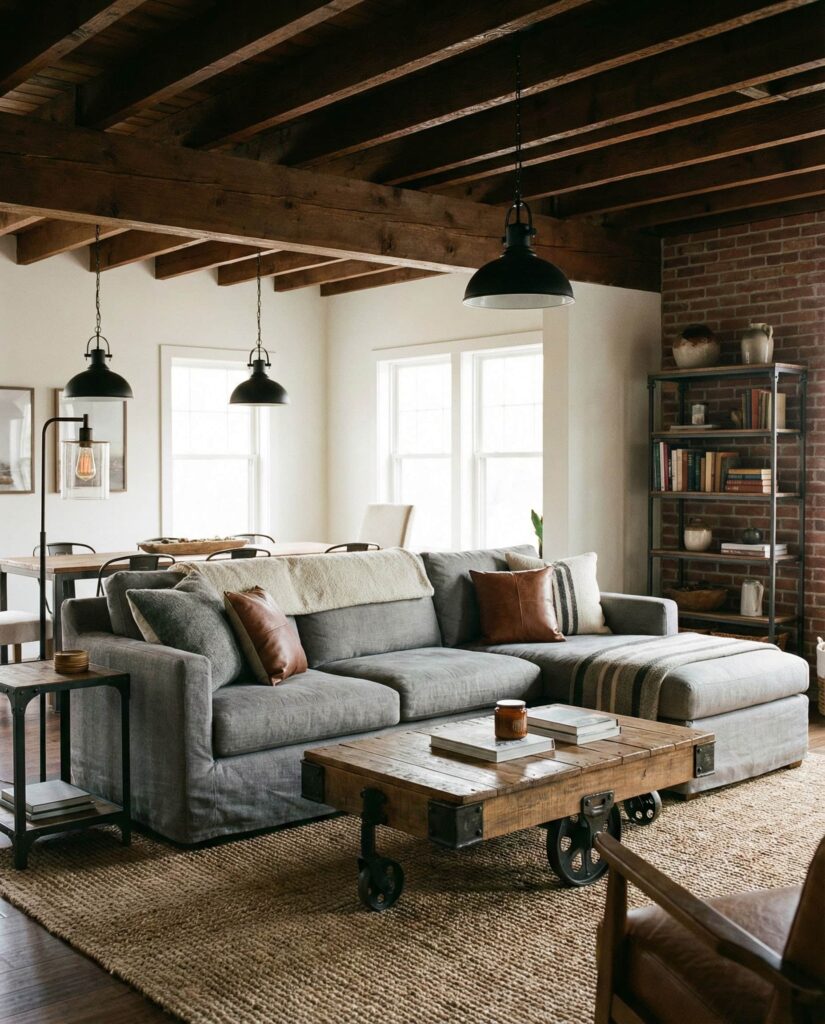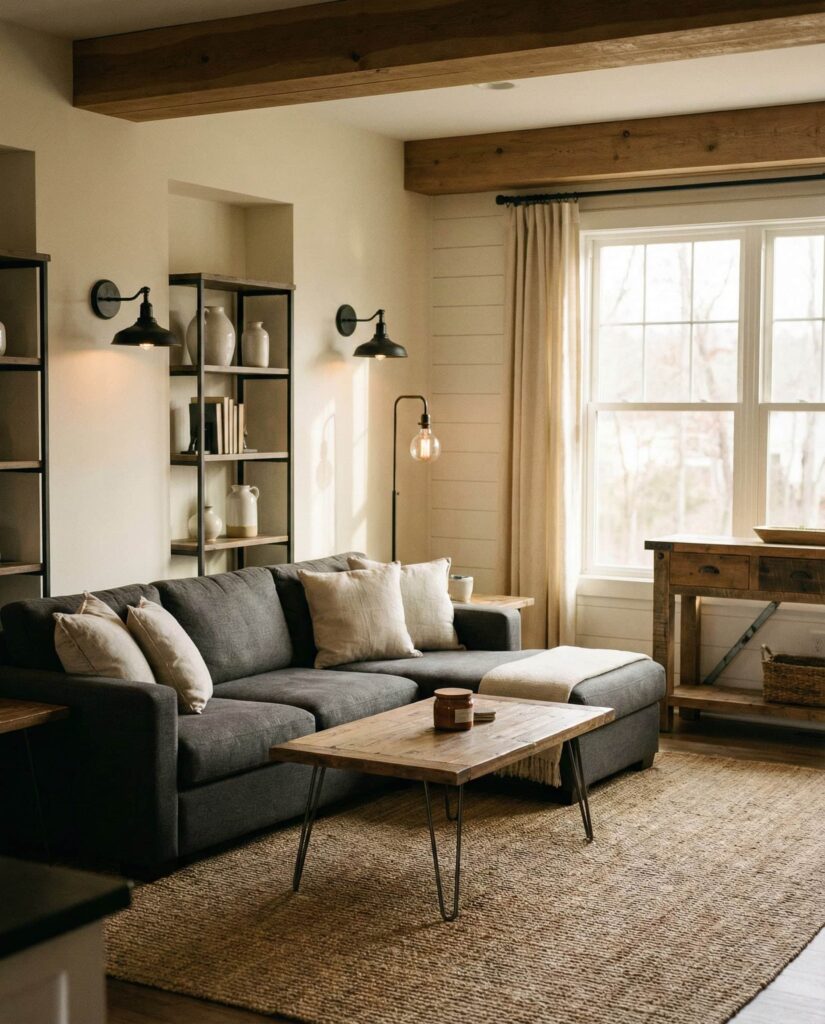 This idea revisits Industrial style through a softer farmhouse lens. Instead of bold metal statements, subtle details like iron light fixtures, steel-framed tables, or exposed hardware add quiet contrast. Paired with Modern farmhouse Furniture, neutral Paint colors, and a plush Gray couch, the space feels balanced and livable. This approach is ideal for homeowners who want character without sacrificing warmth. I’ve noticed that these restrained industrial touches age well, blending seamlessly with wood textures, a neutral Rug, and layered Lighting. The result is understated, practical, and effortlessly cozy.