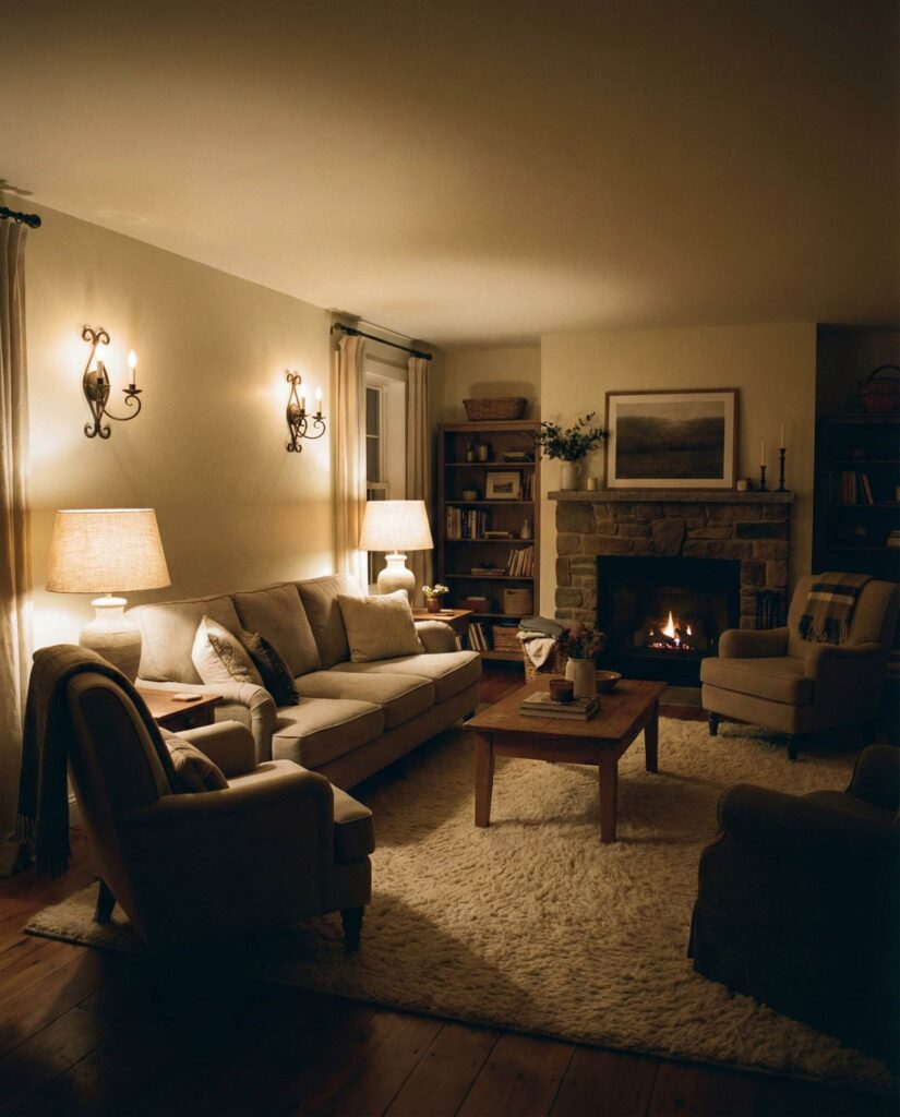Lighting is becoming one of the most important designs elements in farmhouse living rooms. Instead of a single overhead fixture, this idea layers ambient, task, and accent Lighting. Table lamps, wall sconces, and subtle floor lighting add depth and flexibility. This approach enhances Moody or neutral colors alike, allowing the room to shift from daytime brightness to evening cozy comfort. Paired with farmhouse Furniture, soft Curtains, and a textured Rug, layered lighting turns everyday living rooms into adaptable, welcoming spaces.
