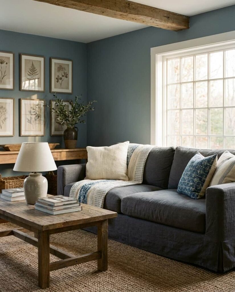A farmhouse living room grounded in Blue tones feels serene and timeless. Soft navy, slate blue, or muted denim shades work beautifully with farmhouse textures and Vintage accents. This idea suits homeowners who want color without visual noise. A Gray couch, natural wood tables, and subtle Wall decor balance the palette. I’ve seen this style work especially well in family homes, where calm environments are appreciated. Paired with warm Lighting and neutral Paint colors, blue brings depth while preserving farmhouse comfort.