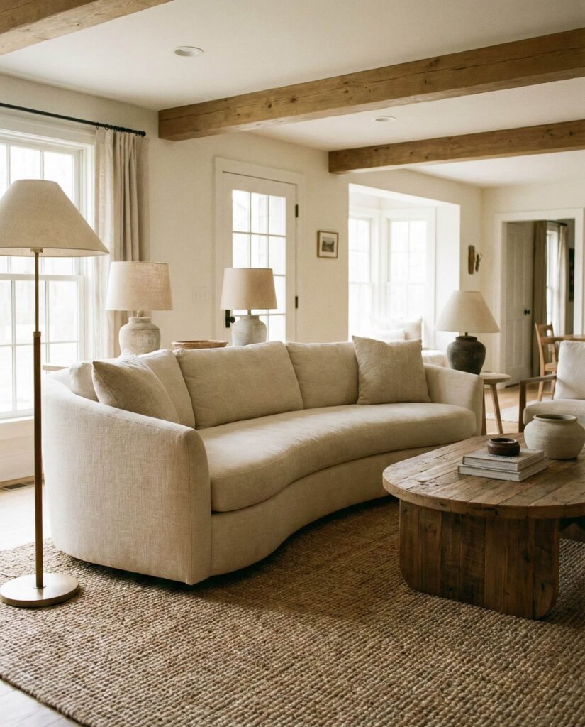 Curves are softening farmhouse interiors. Rounded sofas, arched mirrors, and oval coffee tables bring a gentle flow to traditionally boxy layouts. This idea pairs curved Furniture with Modern farmhouse foundations, making the space feel approachable and human. Neutral colors, a plush Rug, and subtle Wall decor keep the room cohesive. I’ve noticed that curved seating encourages conversation and comfort, enhancing the cozy factor without sacrificing style. It’s a subtle shift that feels fresh yet familiar.