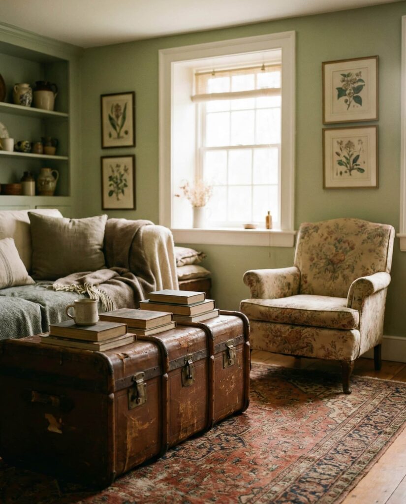 Vintage details are returning in a quieter, more meaningful way. Instead of flea-market overload, farmhouse living rooms now showcase one or two well-loved pieces—a weathered trunk, an English roll-arm chair, or a faded Rug with history. These elements pair beautifully with updated Paint colors like warm cream or muted Green, adding depth without clutter. This cozy approach resonates with homeowners who want rooms that tell a story. I’ve seen families center conversations around inherited furniture or salvaged finds, proving that decor can be emotional as well as visual. When balanced with modern upholstery and practical layouts, Vintage never feels dated.