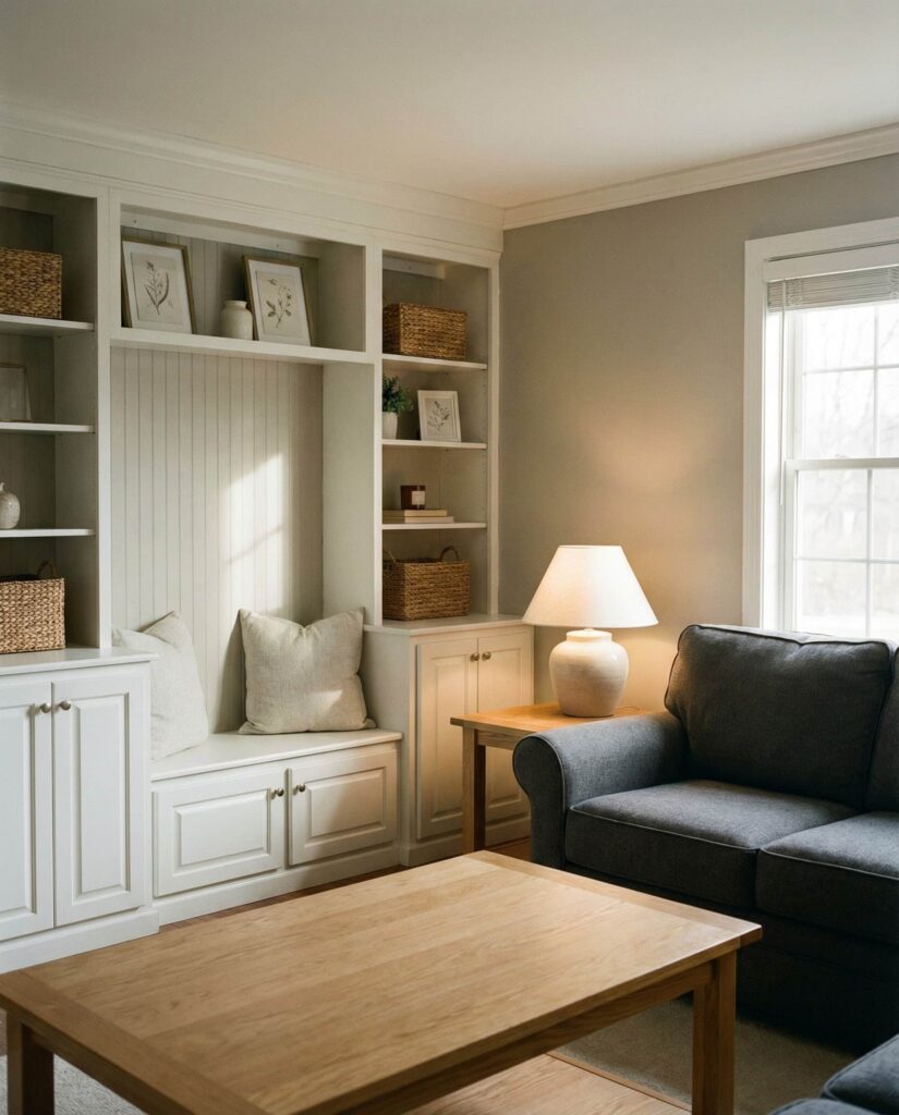 20. Farmhouse Living Room with Built-In Storage and Furniture
