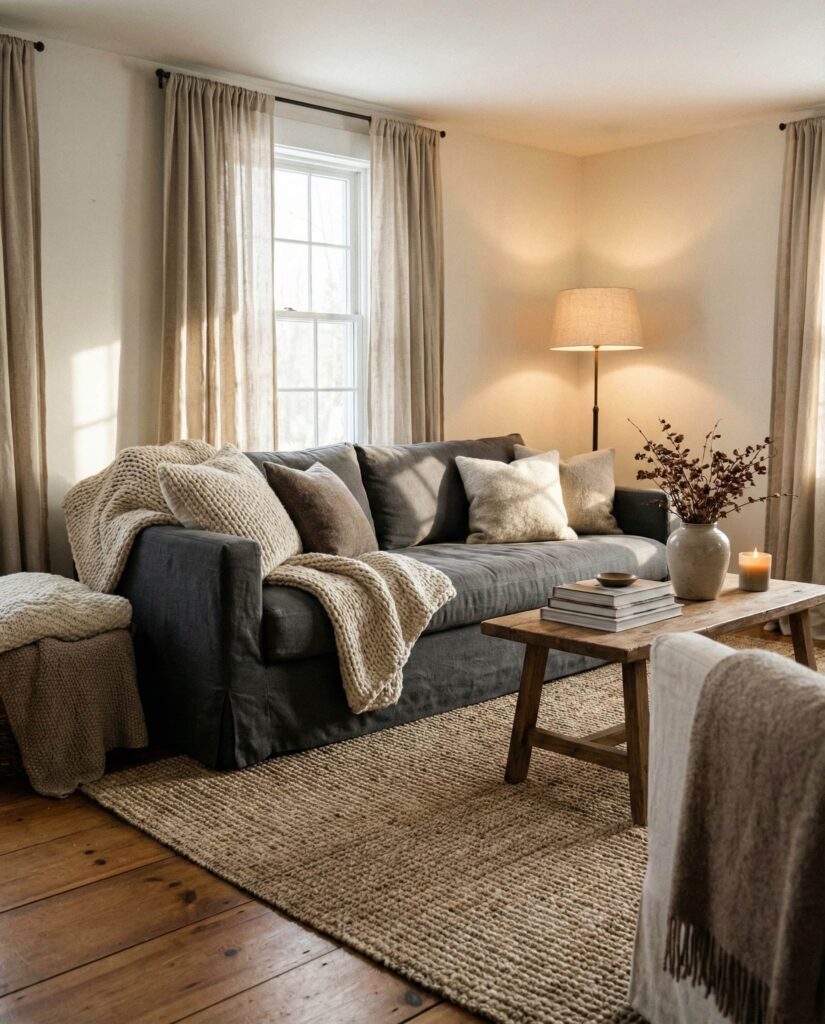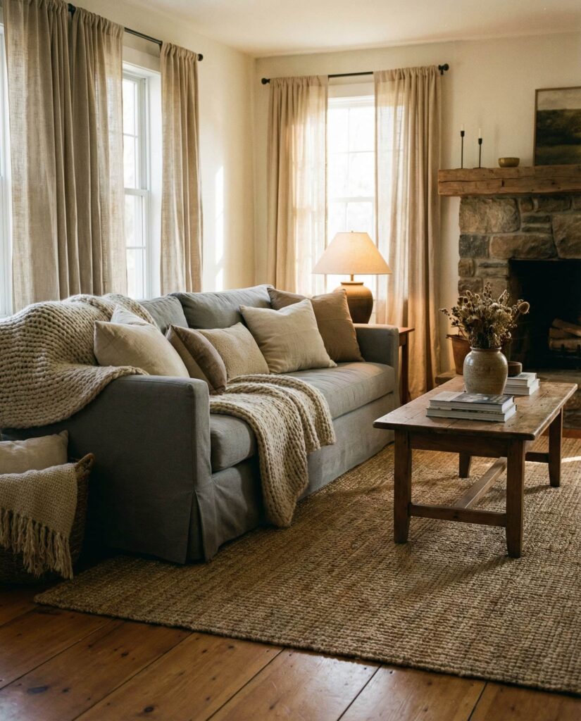 This idea highlights how layered textiles can transform a farmhouse living room into a deeply cozy retreat. Mixing linen Curtains, a textured Rug, soft throws, and upholstered Furniture adds comfort without visual heaviness. The style works well with Modern layouts and neutral Paint colors, especially warm Grey and Earthy tones. A Gray couch becomes the foundation, while pillows in subtle Blue or Green introduce depth. I’ve noticed that homes using this approach feel instantly welcoming, especially in colder climates where comfort matters most. Thoughtful decor ideas and balanced Lighting ensure the room feels intentional rather than layered for the sake of excess.