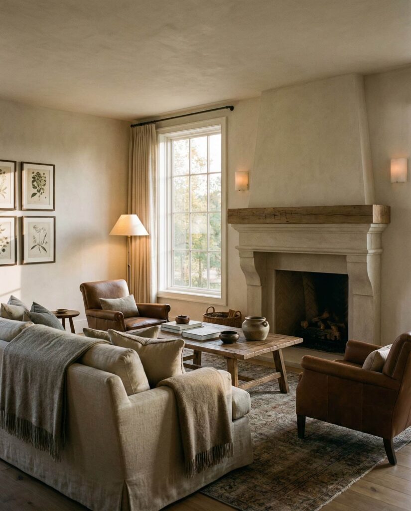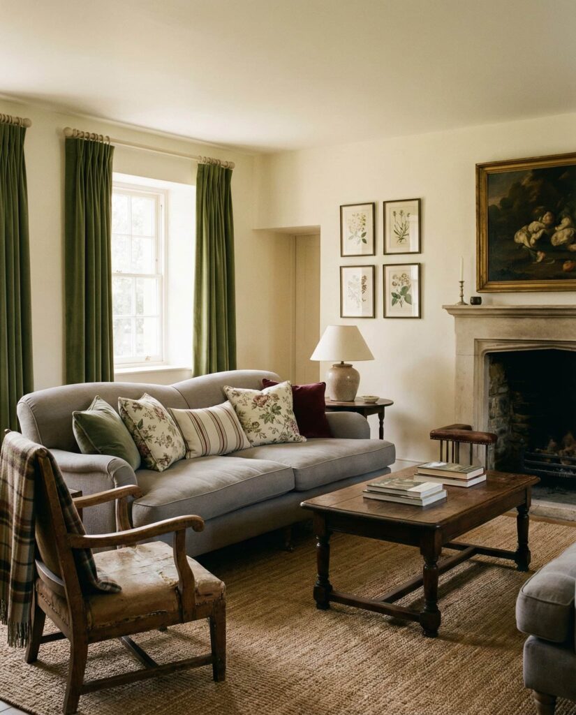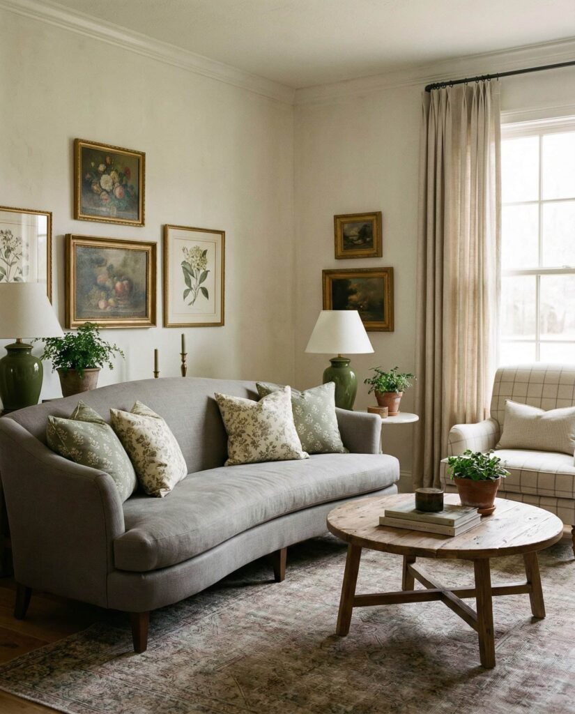 An English-inspired farmhouse living room brings softness and charm into the American farmhouse narrative. This idea blends farmhouse structure with gentle patterns, curved Furniture, and subtle Vintage references. Muted florals, warm Green accents, and traditional Wall decor pair beautifully with neutral colors and a comfortable Gray couch. The result feels refined yet relaxed, ideal for homeowners who love classic style without formality. I’ve seen this approach work especially well in older homes, where architectural details deserve equally thoughtful interiors. Balanced Lighting and tactile fabrics keep the space grounded and cozy.