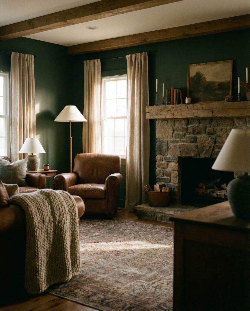 Moody farmhouse living rooms are gaining traction as homeowners grow bolder. Deep Green, charcoal Grey, and even muted Blue walls create intimacy, especially around a Fireplace. This look thrives on contrast—dark Paint colors balanced by lighter Rug choices and soft textiles. I’ve seen this approach transform standard rooms into evening retreats. Thoughtful Lighting is essential here, turning darkness into drama rather than gloom. It’s a confident evolution of farmhouse style.