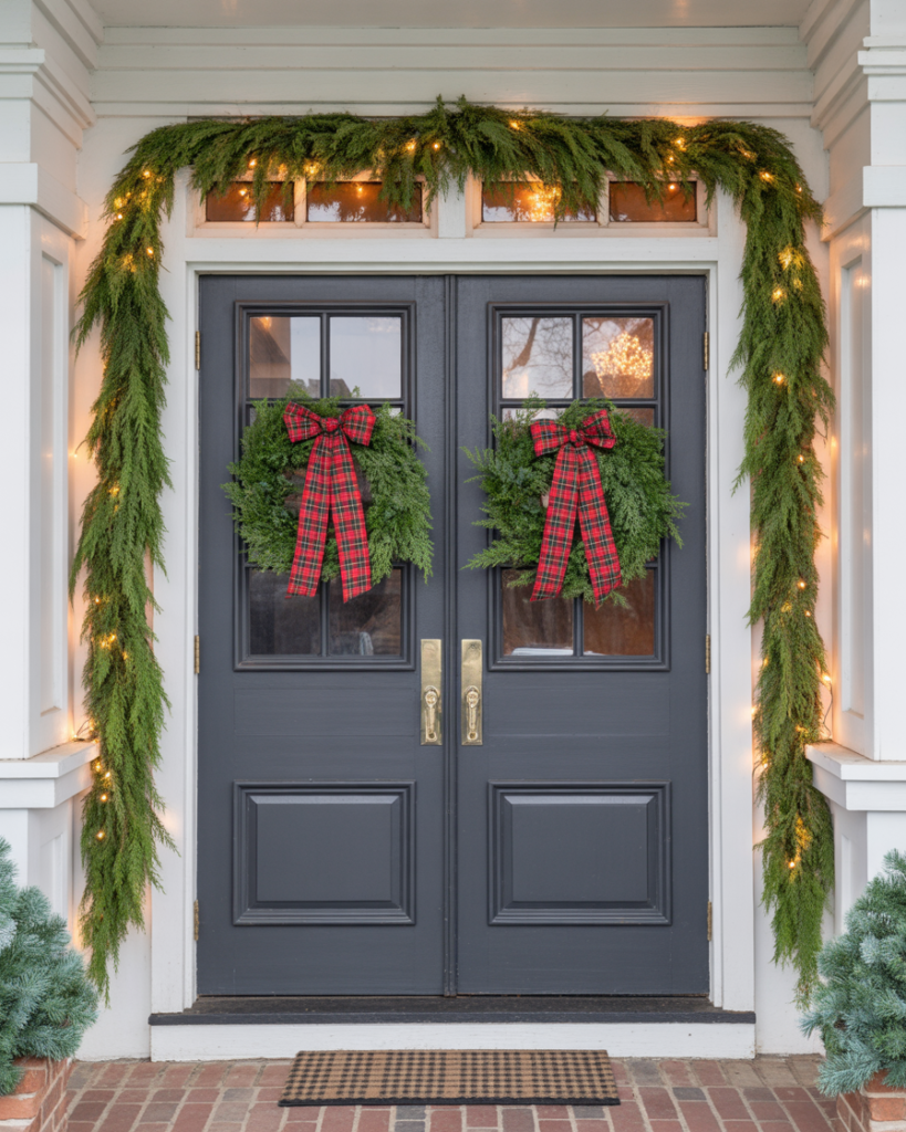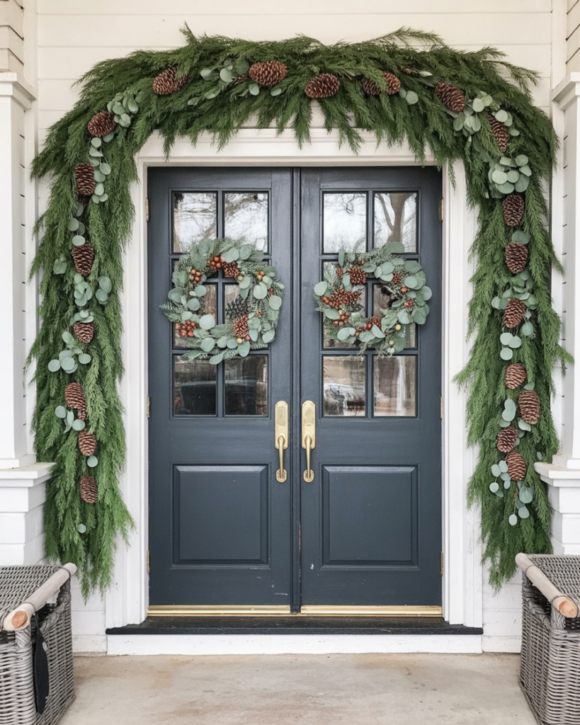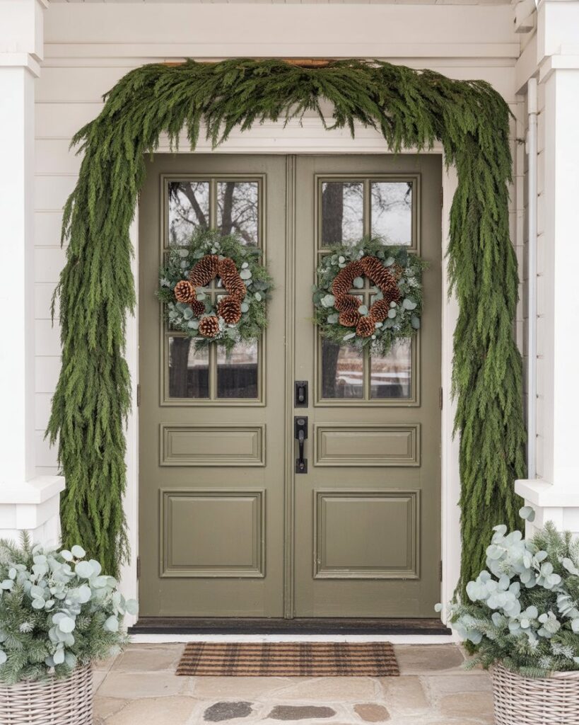 Frame your double doors with a lush evergreen arch. Mix cedar, eucalyptus, and pine cones to add texture. This ideas double doors entryway creates a large, festive centerpiece. It’s a farmhouse-meets-rustic concept that blends perfectly with wood accents and white walls.
