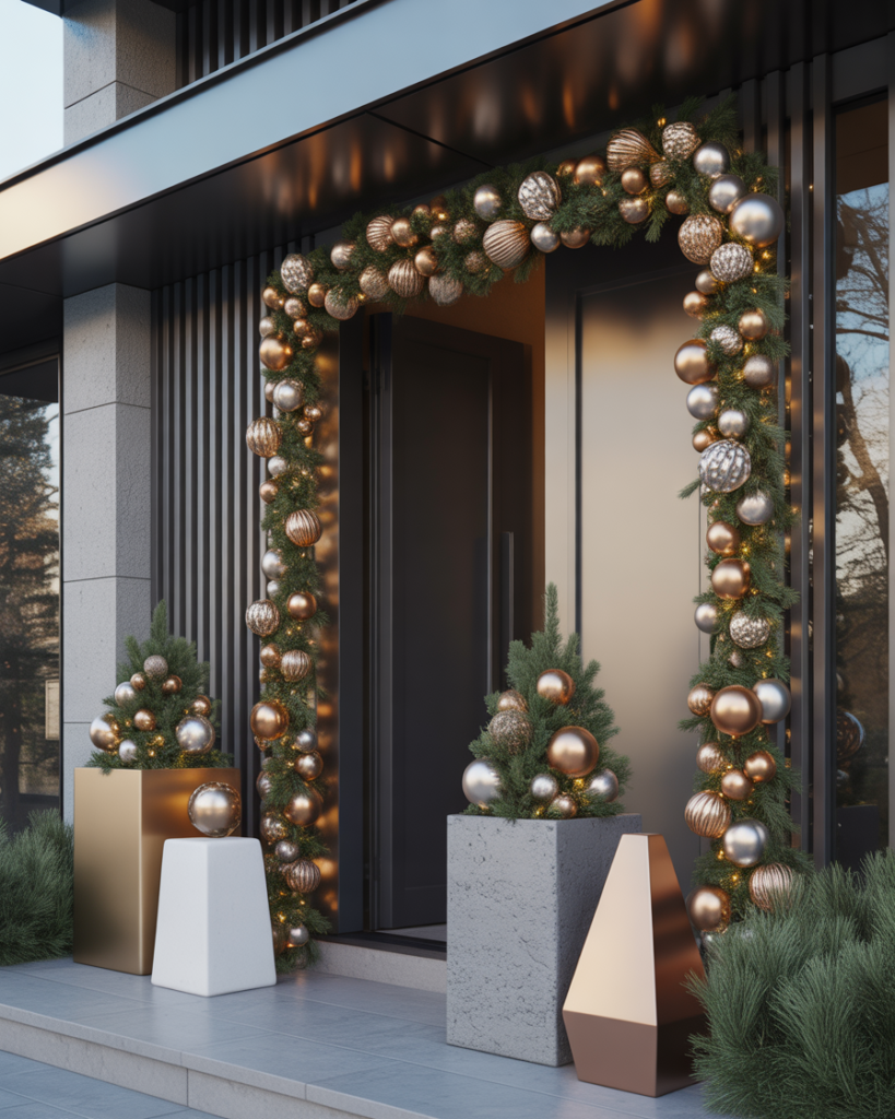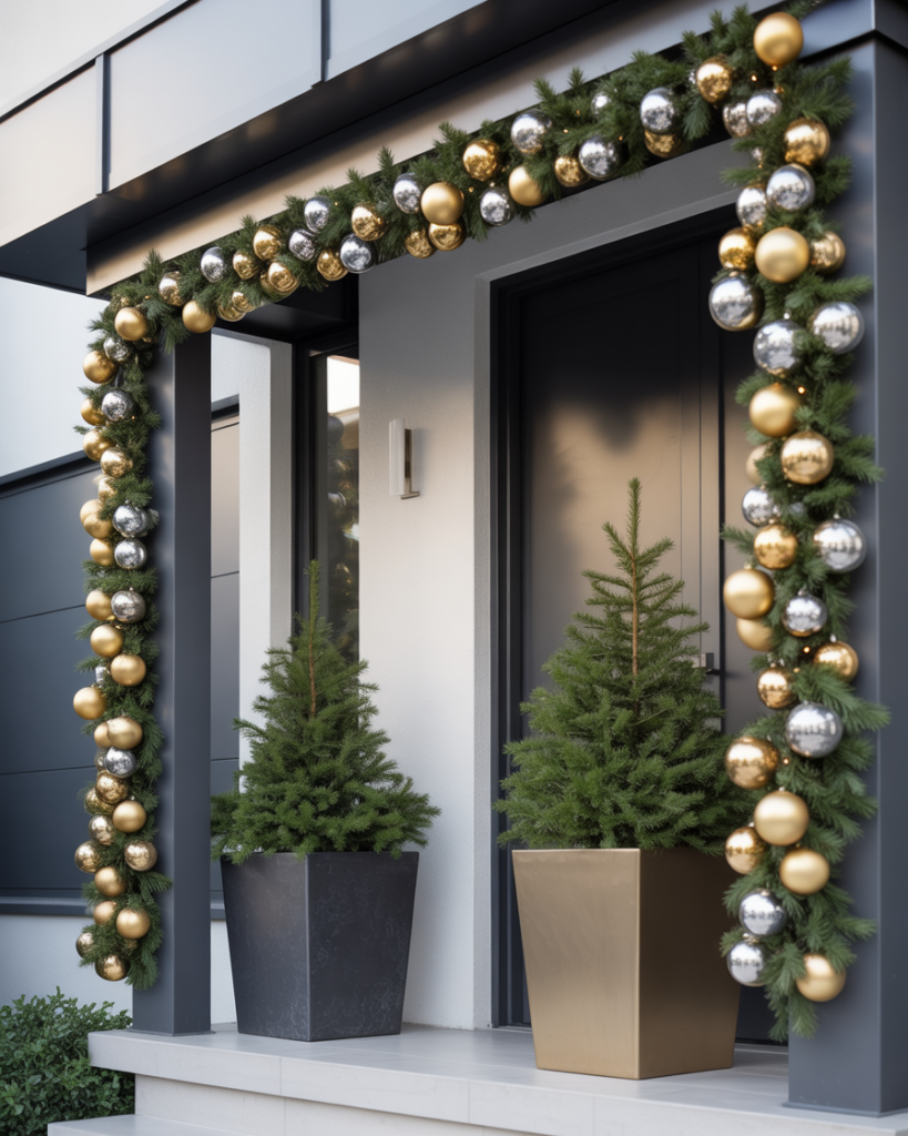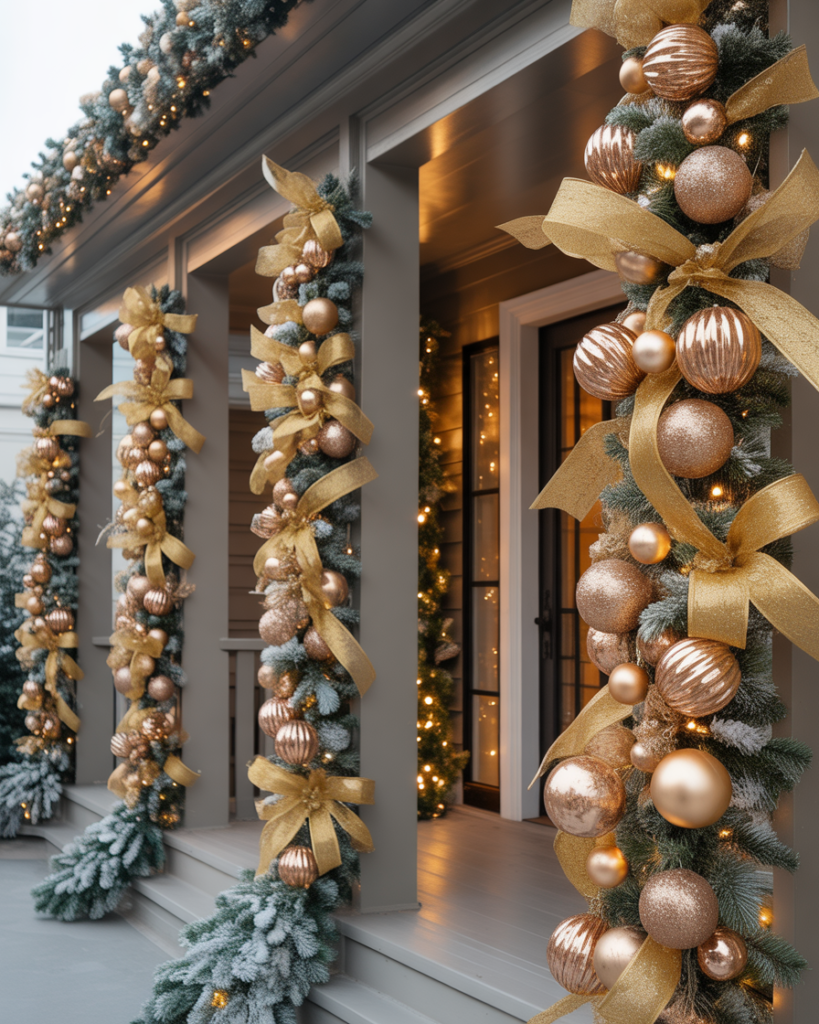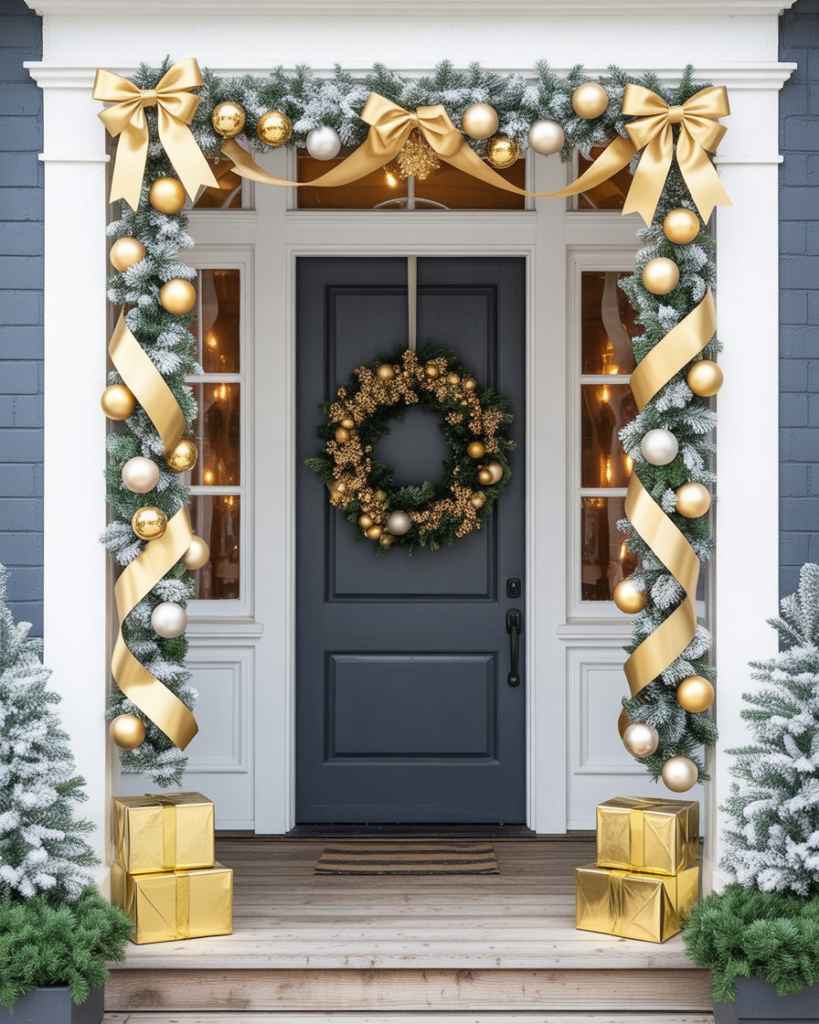 If you love sparkle, go for ideas modern with metallic tones—gold ribbons, shiny ornaments, and frosted ideas garlands. This look feels classy and chic, channeling luxury without losing warmth. As Elle Decor notes, metallics can modernize even the most traditional farmhouse porch.