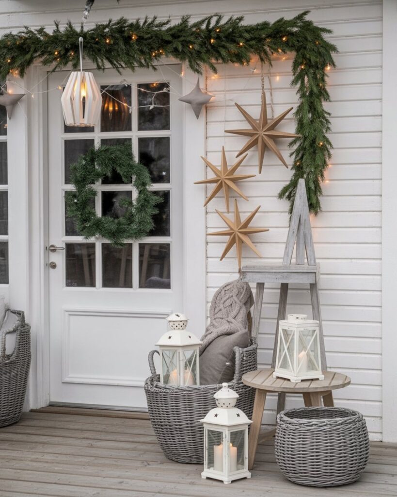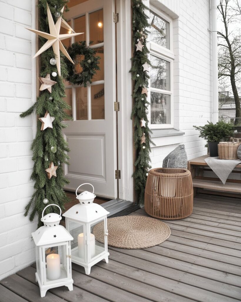 For those drawn to calm, neutral tones, embrace ideas diy minimalist inspired by Scandinavian design. Use white lanterns, wooden stars, and light pine garlands. This look celebrates simple, modern, and classy aesthetics while keeping your outdoor space bright and inviting. A few candles make it feel like hygge heaven.