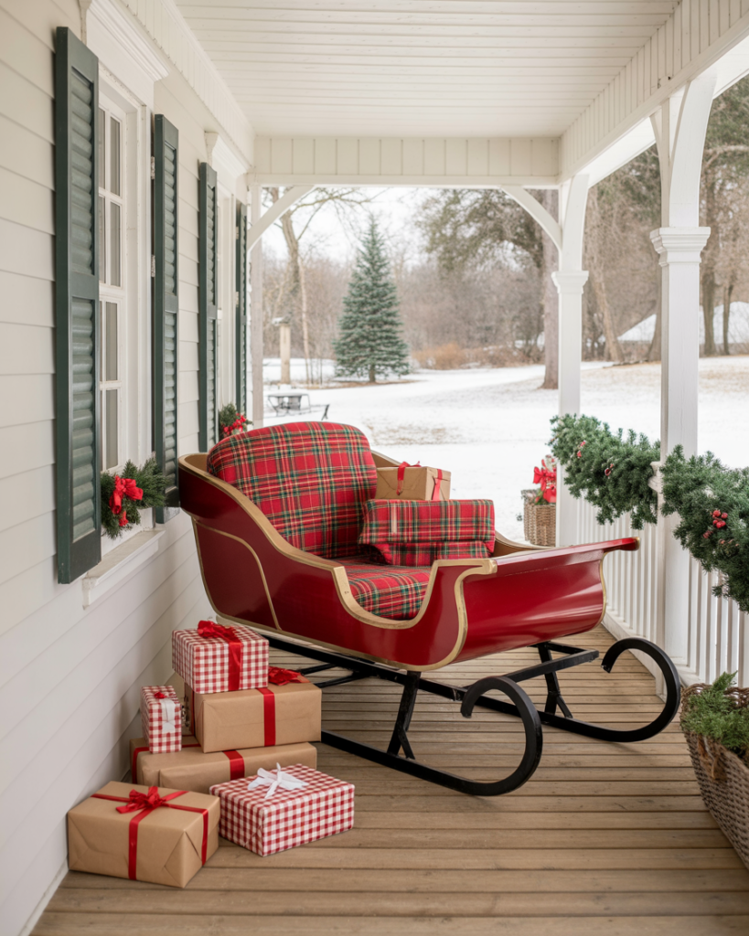 Add a touch of nostalgia with an antique sleigh decorated with plaid blankets, faux gifts, and ideas garlands. This country-chic setup recalls old-fashioned winters. Ideas diy rustic touches like wooden skis or skates nearby make the scene warm, cozy, and perfect for covered porches.