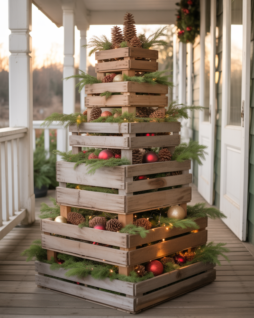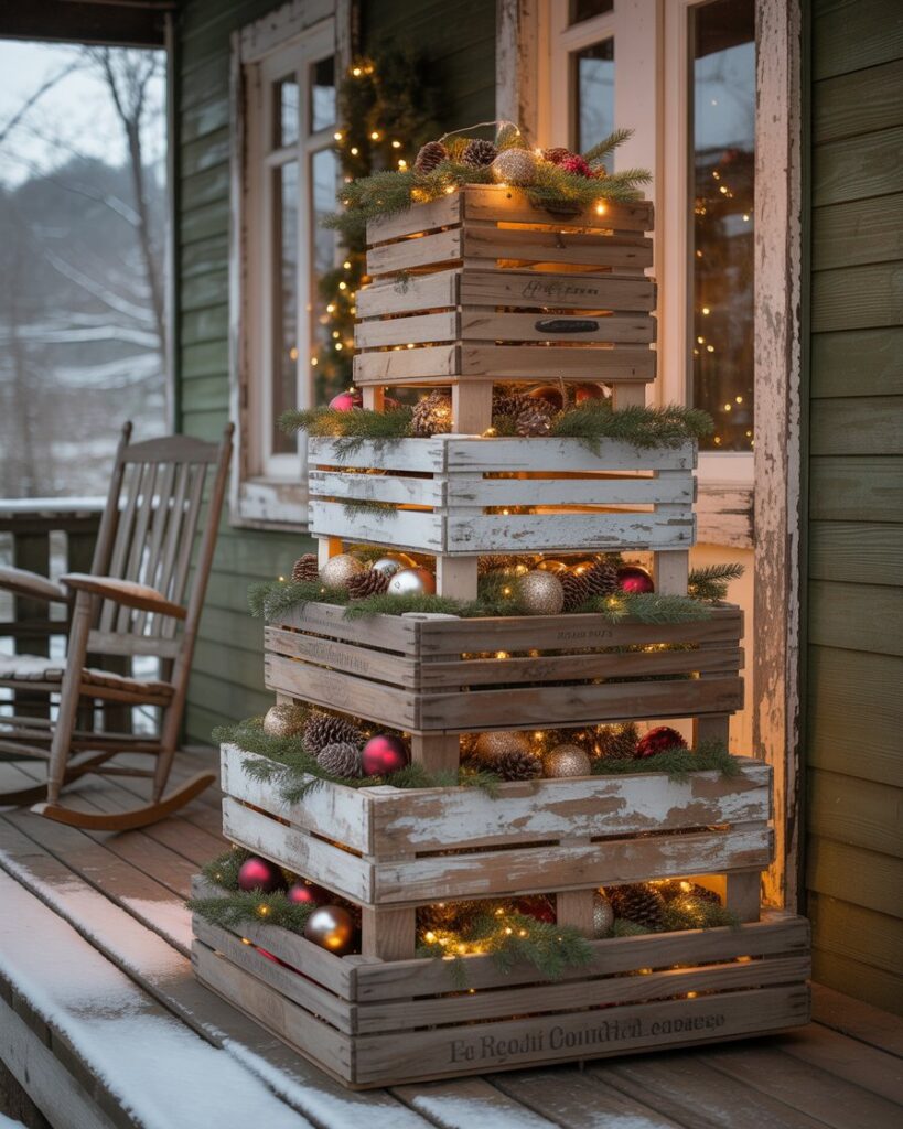 Stack wooden crates in a tree shape and fill each level with ornaments, pinecones, and greenery. This ideas diy rustic project is both simple and creative. It fits beautifully into a country or farmhouse theme and works well even on a small covered porch.