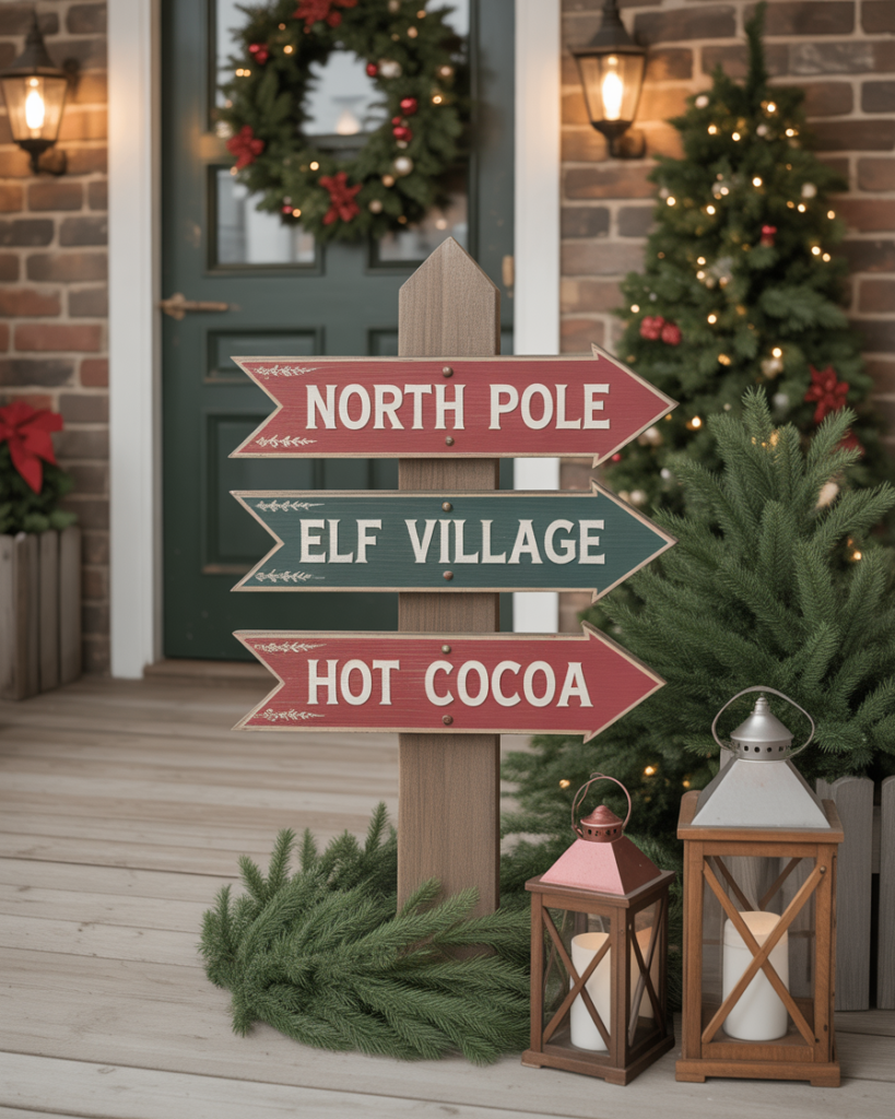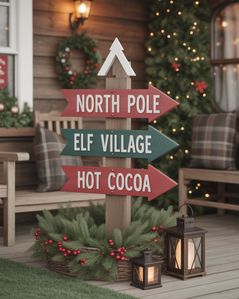A wooden signpost pointing “North Pole,” “Elf Village,” and “Hot Cocoa” adds whimsy and charm. This ideas diy rustic piece is easy to build with scrap wood and paint. It works for outdoor setups or covered spaces and pairs beautifully with lanterns or ideas pots planters easy.