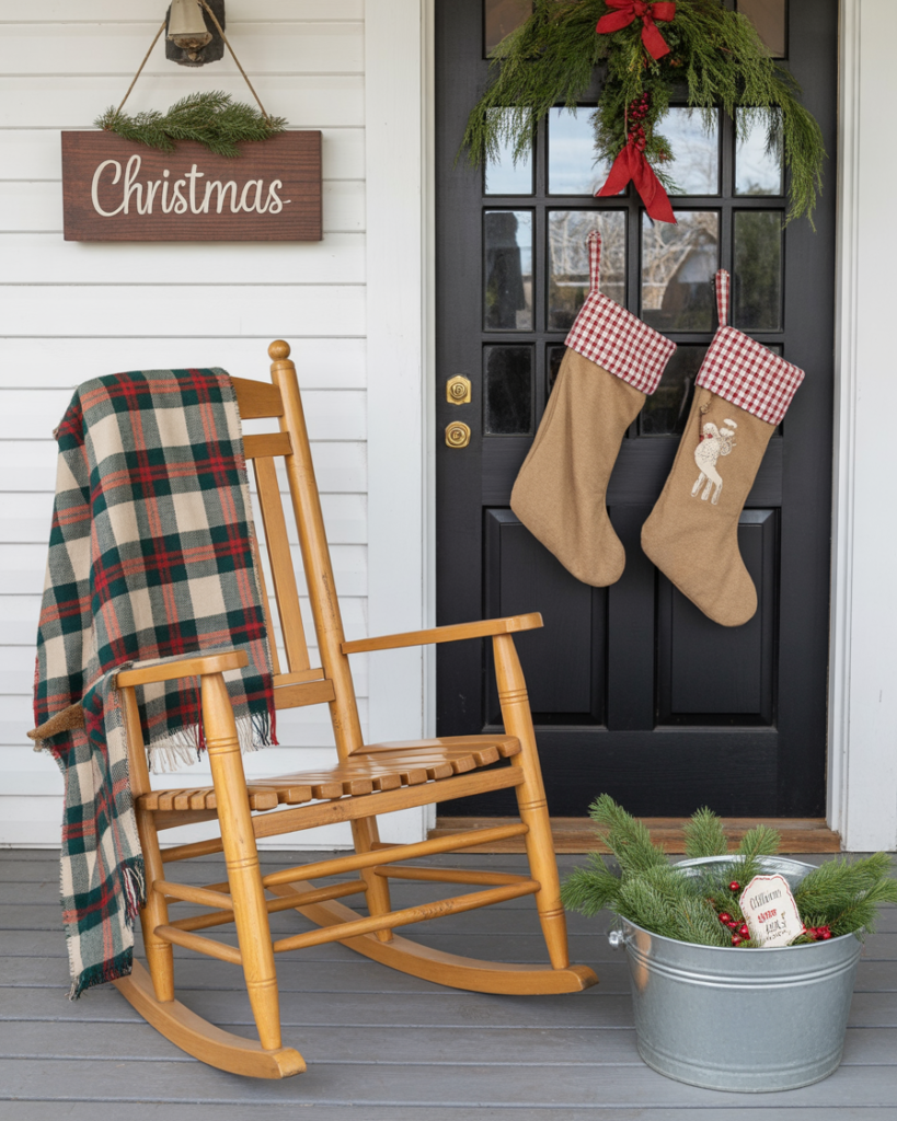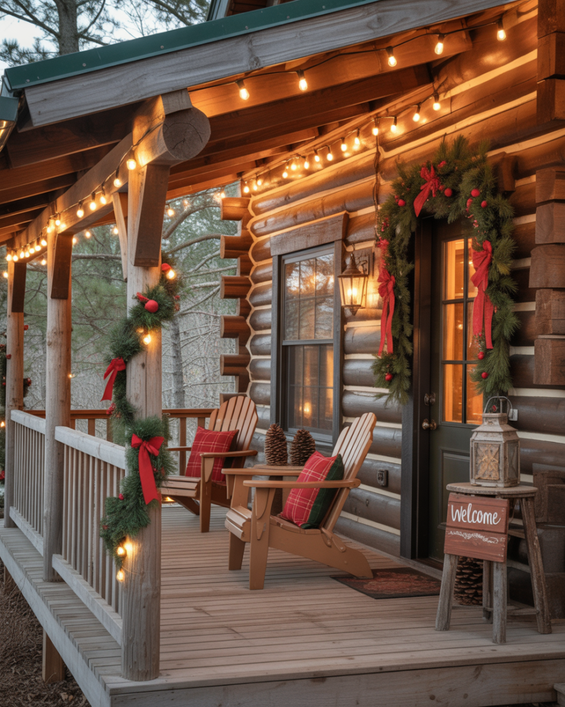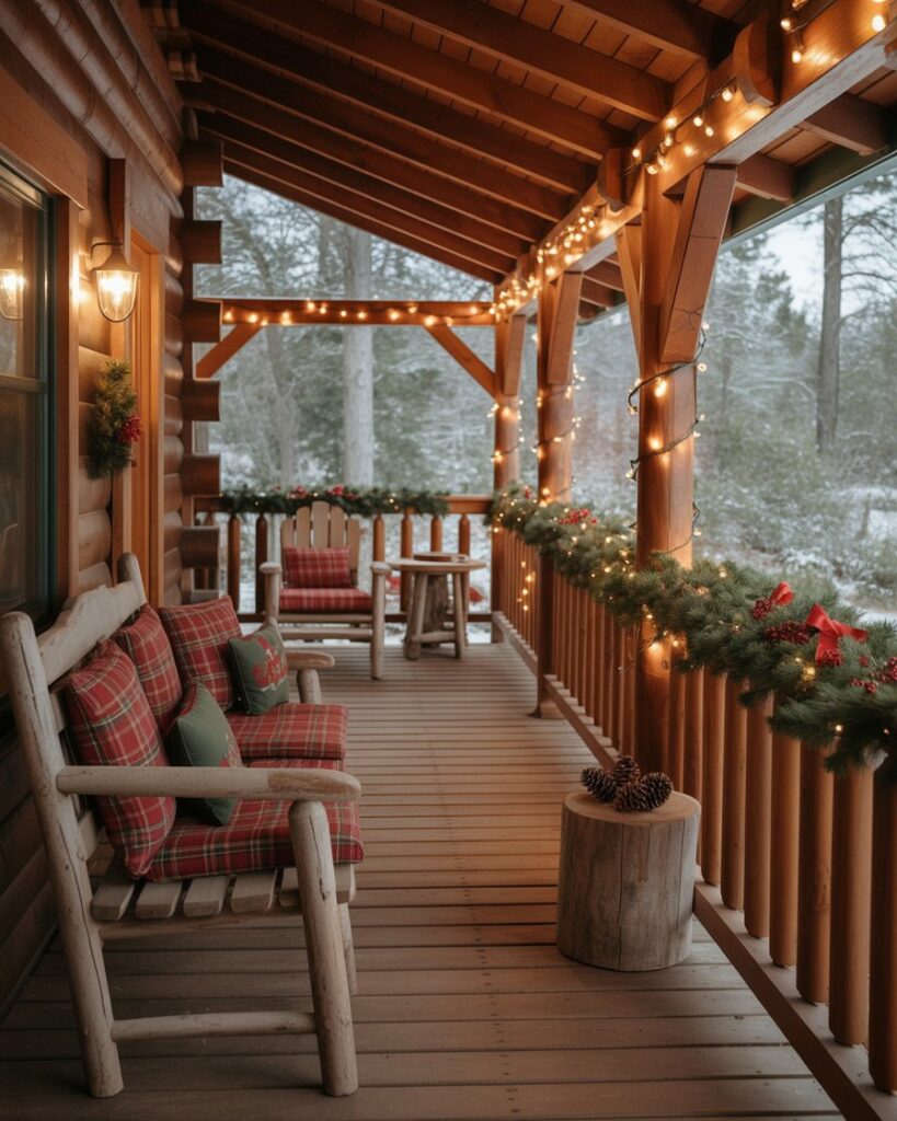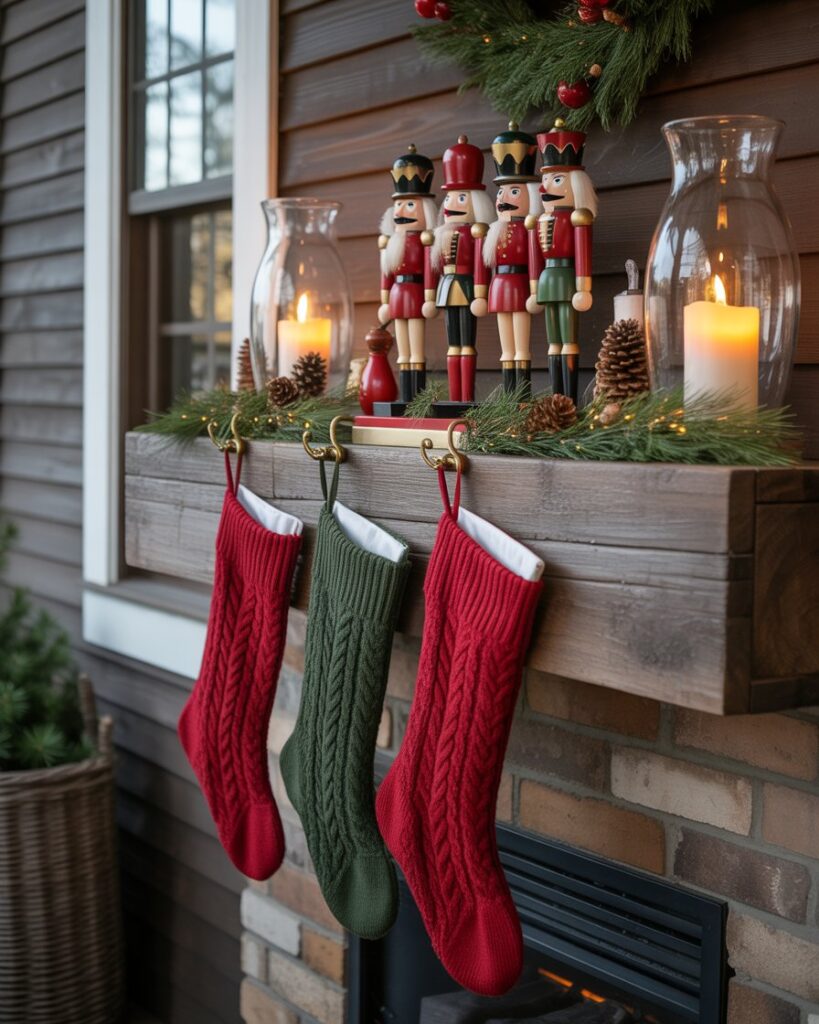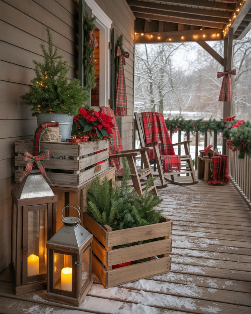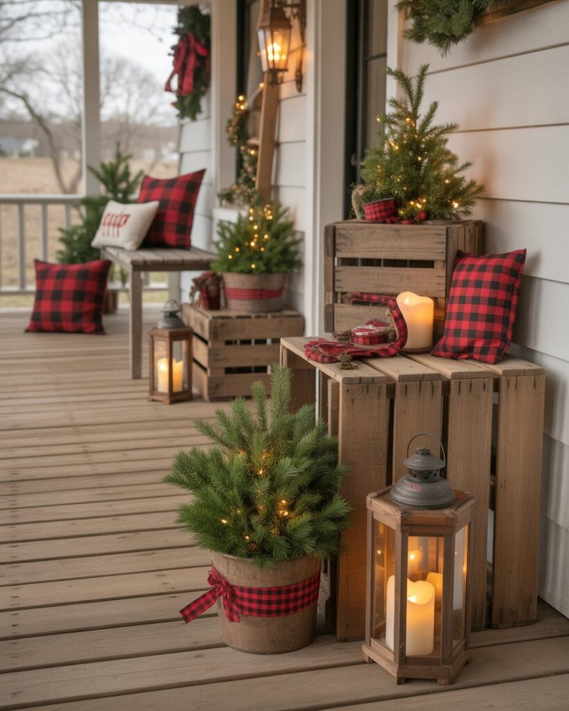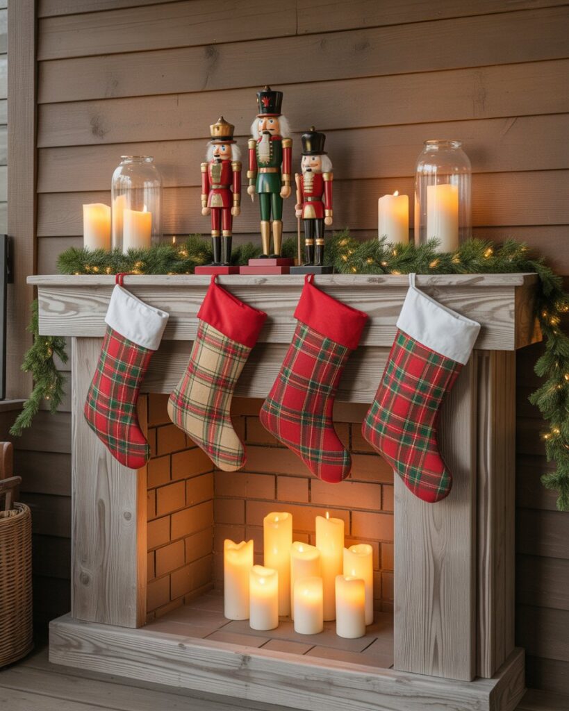 If you don’t have a real one, create a faux log cabin mantel from crates or wood boards. Decorate it with stockings, candles, and a nutcracker centerpiece. This ideas diy display brings indoor warmth outside and transforms your outdoor porch into a festive gathering space.