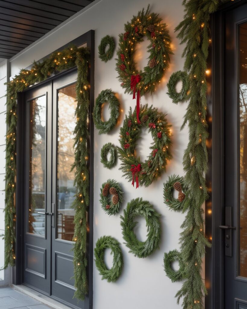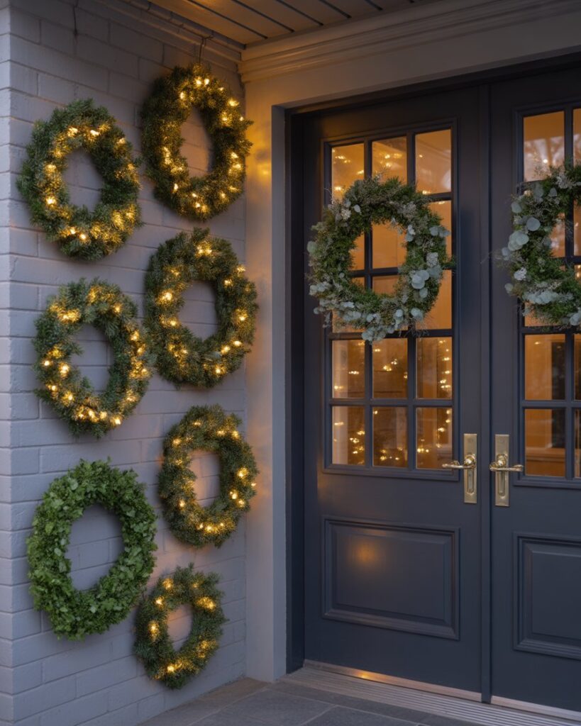 Instead of one wreath, display several of varying sizes for a large, dramatic impact. Combine natural greenery, ribbons, and ideas lights for texture. This ideas diy minimalist approach is modern yet festive—especially effective on a blank wall beside double doors.