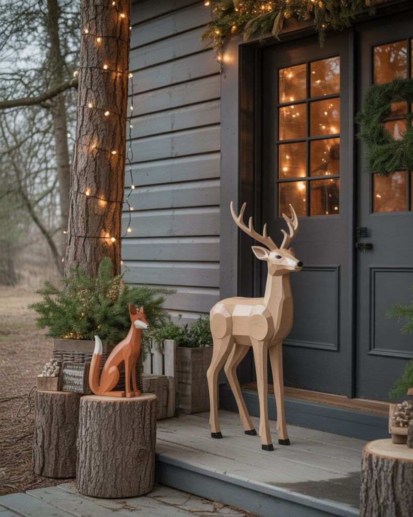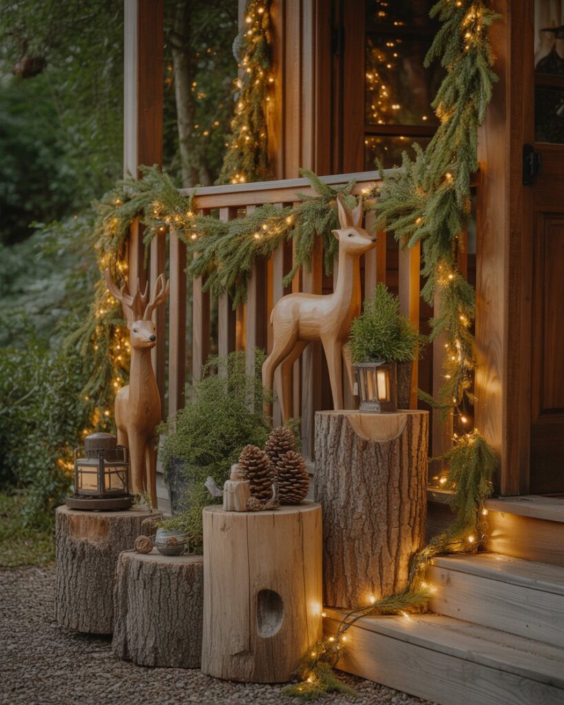 Invite charm to your porch with wooden deer, foxes, or bears amid greenery. This ideas rustic theme feels like a winter forest scene and suits farmhouse or country homes. Add fairy ideas lights and tree stumps for height, creating a storybook atmosphere that delights both kids and adults.