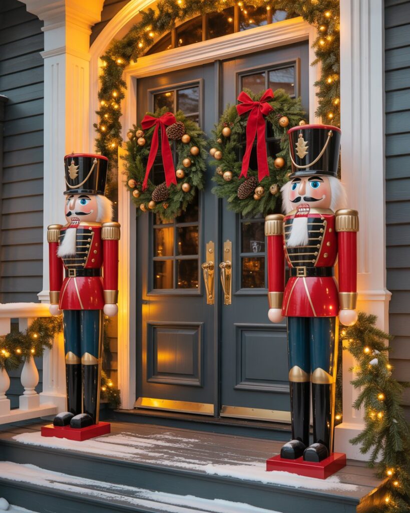 Two nutcracker figures guarding your double doors entryway make a grand yet playful statement. Whether tall or large, they add instant drama and tradition. Combine them with symmetrical wreaths for balance. HGTV recommends adding ideas lights to highlight these cheerful guardians during evening hours.
