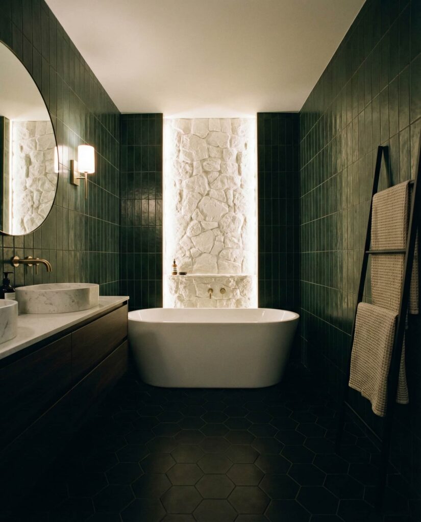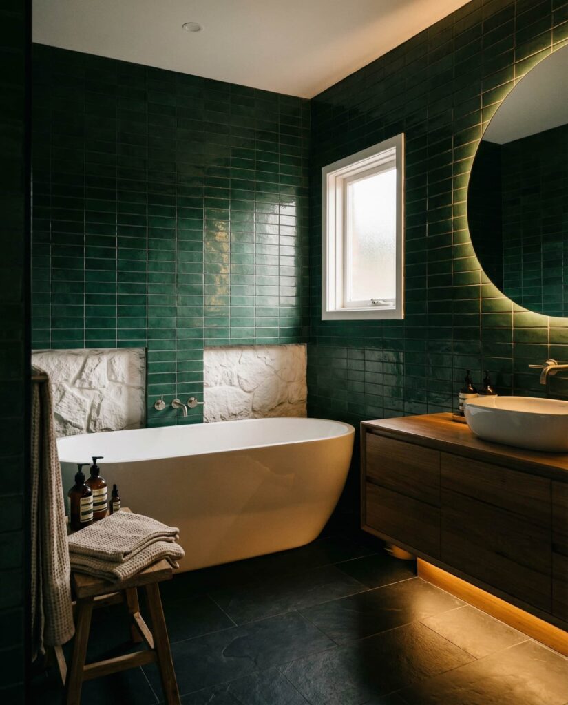 Dark green tiles are becoming a favorite among homeowners who want a bathroom that feels intentional and atmospheric rather than purely functional. When paired with a black floor, subtle lighting, and a contrasting white and stone wall, this approach feels refined instead of heavy. Designers at sites like Apartment Therapy often note how darker palettes age better over time. This design works especially well in primary bathrooms where a freestanding bathtub or deep tub becomes the visual anchor. I’ve seen friends hesitate with dark colors, only to admit later that the space feels calmer at night, like a private retreat rather than a pass-through room.