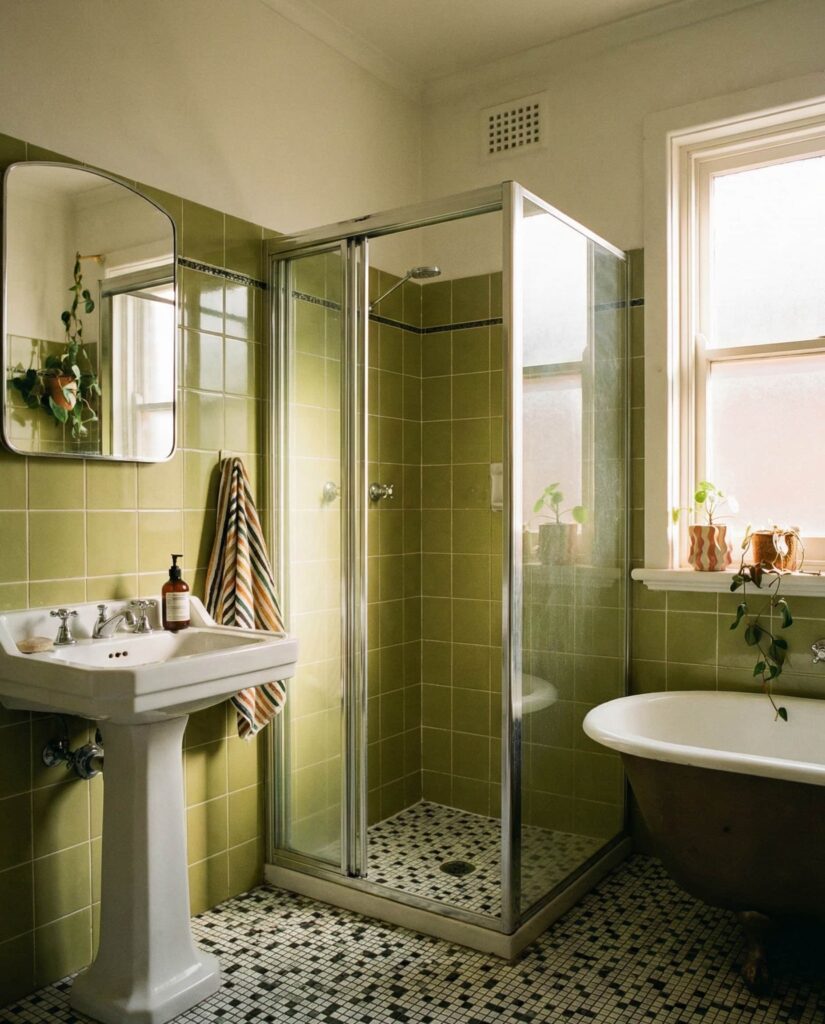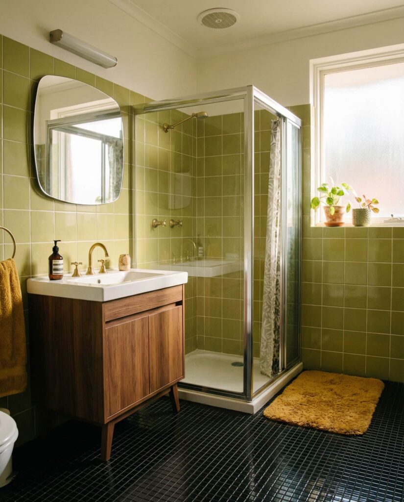 A retro green tile bathroom feels playful when paired with a black floor or patterned tile underfoot. This contrast grounds the color and adds visual rhythm without overwhelming the space. Many mid-century-inspired homes use this formula successfully, especially when combined with simple chrome fixtures. Adding a curved mirror or classic shower enclosure reinforces the style. I’ve always admired how retro bathrooms feel fun without feeling temporary, as if they know exactly what they are.