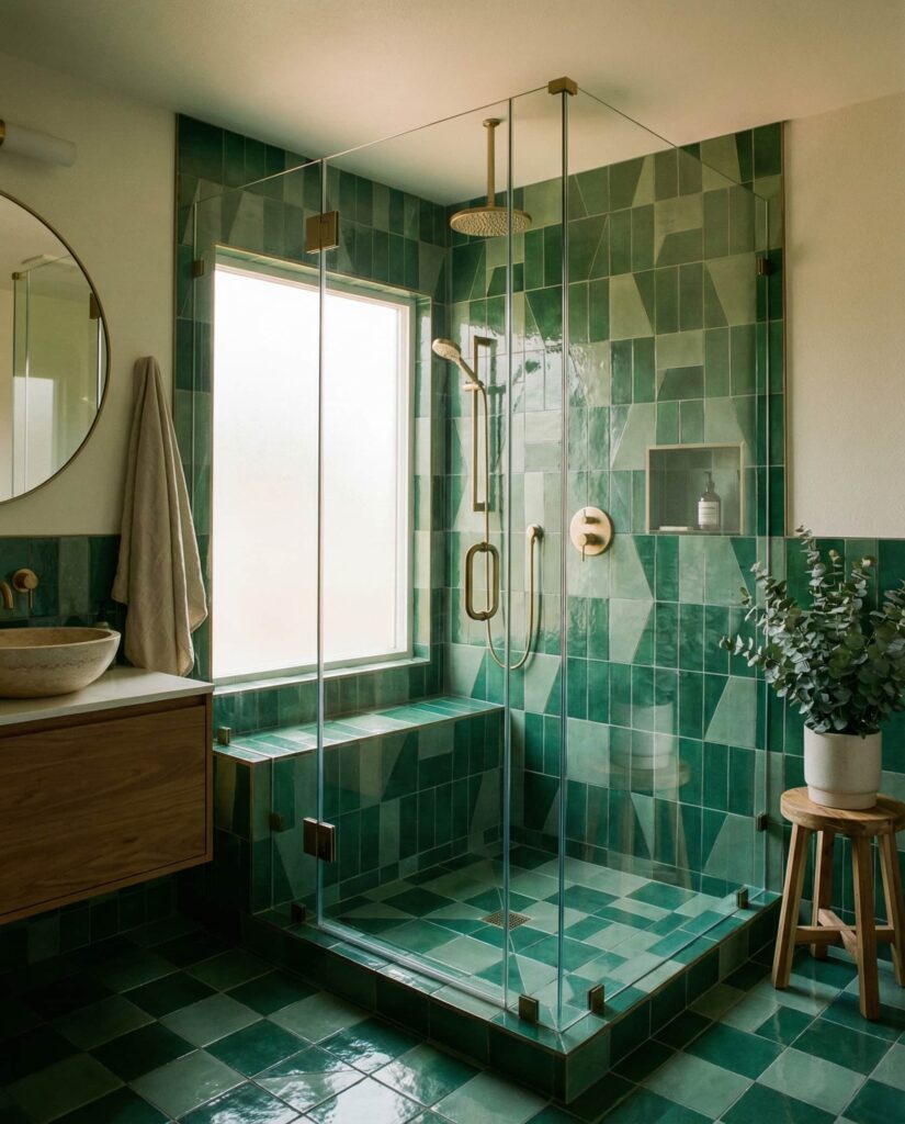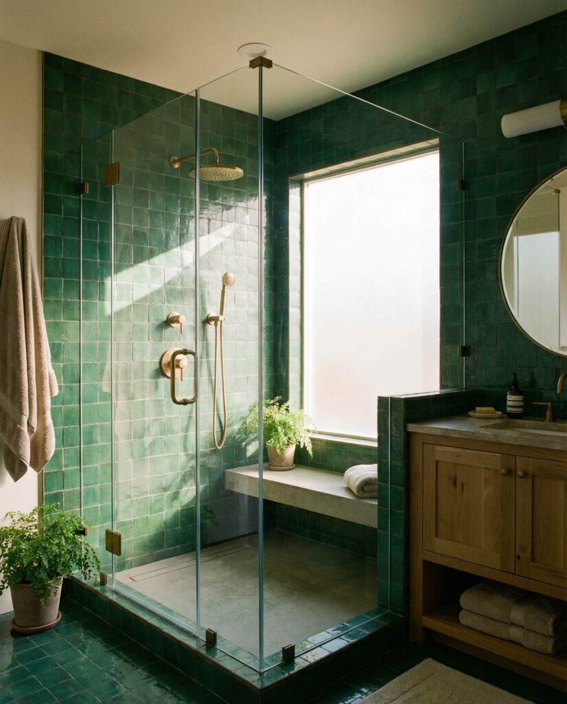 Bathrooms in 2026 increasingly treat shower designs as the focal point rather than an afterthought. Green tiles—especially emerald or forest tones—create a dramatic enclosure when used floor to ceiling. This idea works best with frameless glass and minimal grout to keep the look clean. Many interior design editors highlight how a bold tiled shower elevates even modest homes. I’ve seen guests gravitate toward these bathrooms, curious to step inside a space that feels intentionally designed rather than purely practical.