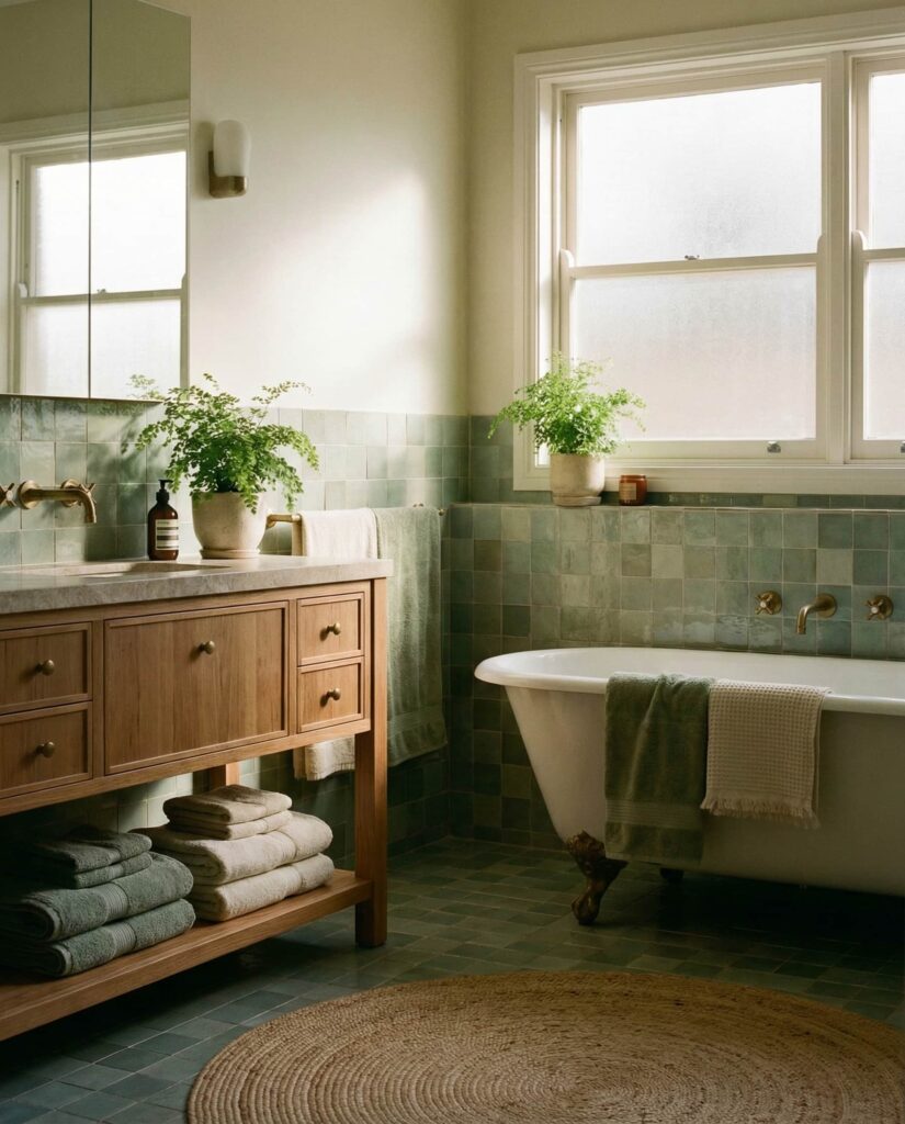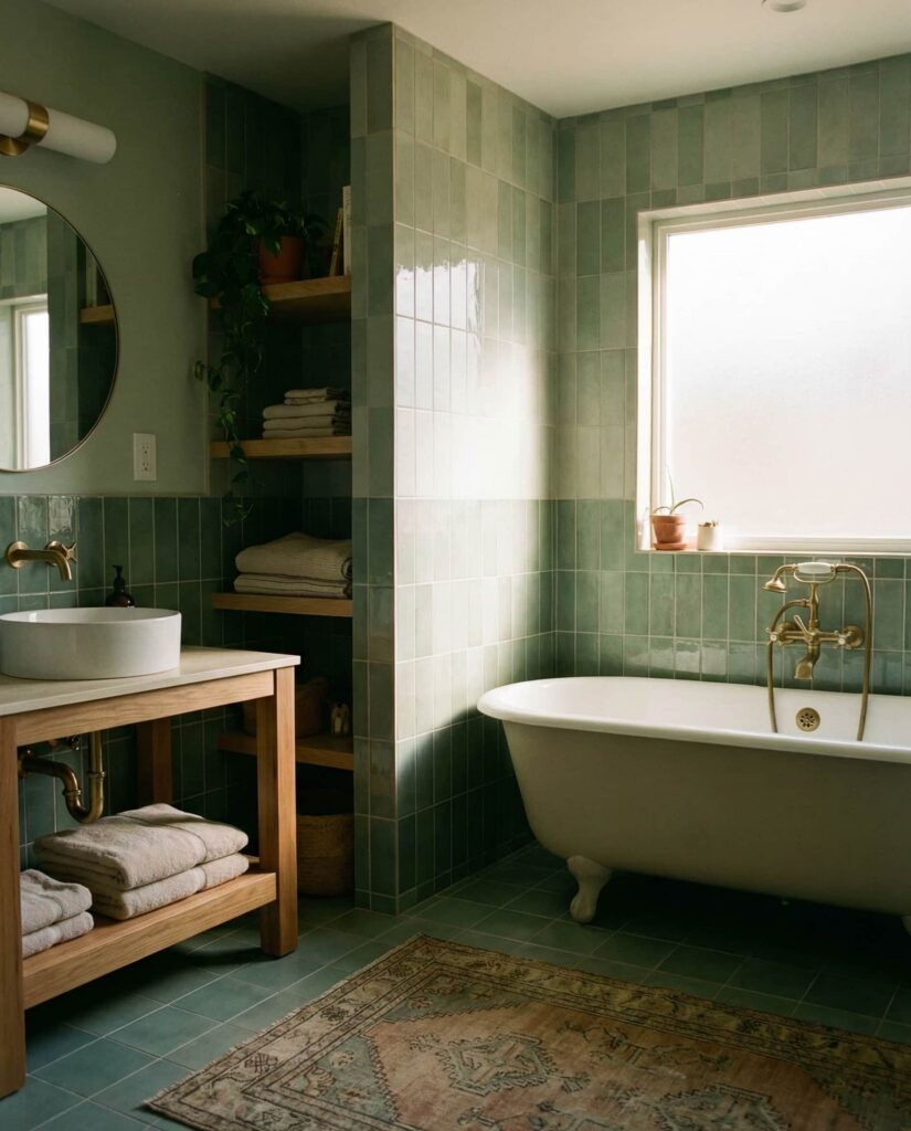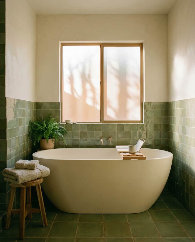 A green tile bathroom built around a sculptural bathtub feels luxurious without being excessive. This idea often uses sage, olive, or jade tiles as a backdrop, letting the tub stand out as a centerpiece. Designers recommend keeping surrounding elements simple—neutral wall finishes, discreet storage, and soft lighting. I’ve noticed that homeowners who prioritize the bathtub tend to view the bathroom less as a utility space and more as a personal retreat.