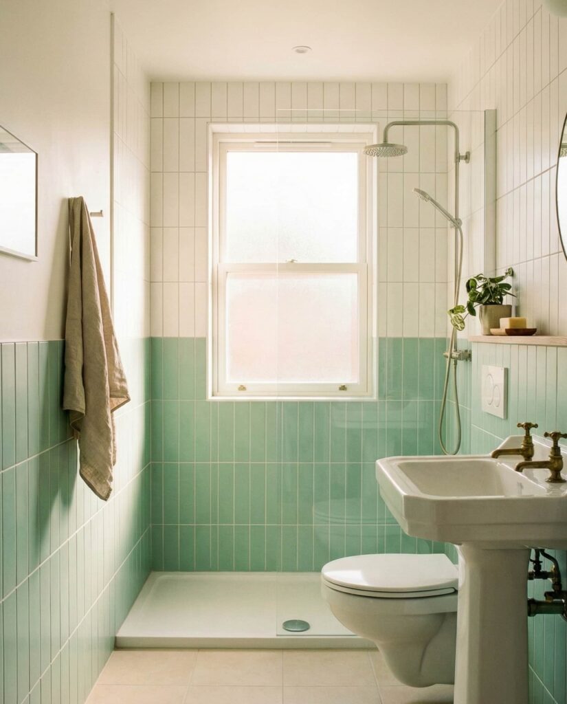 Combining mint green tile white and neutral surfaces is a reliable strategy for compact bathrooms. This design maximizes brightness while still offering color and character. Many professionals suggest using mint tiles vertically on the wall to visually stretch the room. A light floor and reflective finishes keep the space feeling open. In apartments and older homes, I’ve seen this approach make small bathrooms feel far more generous than their square footage suggests.