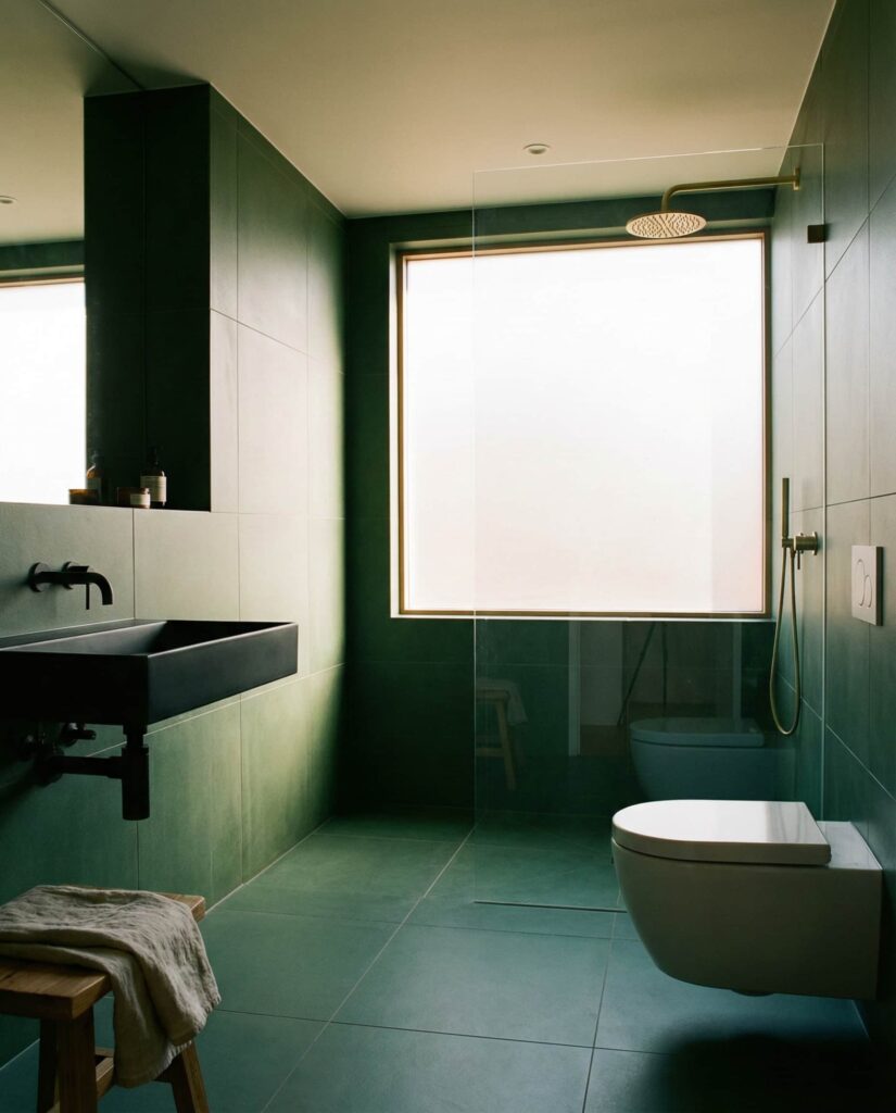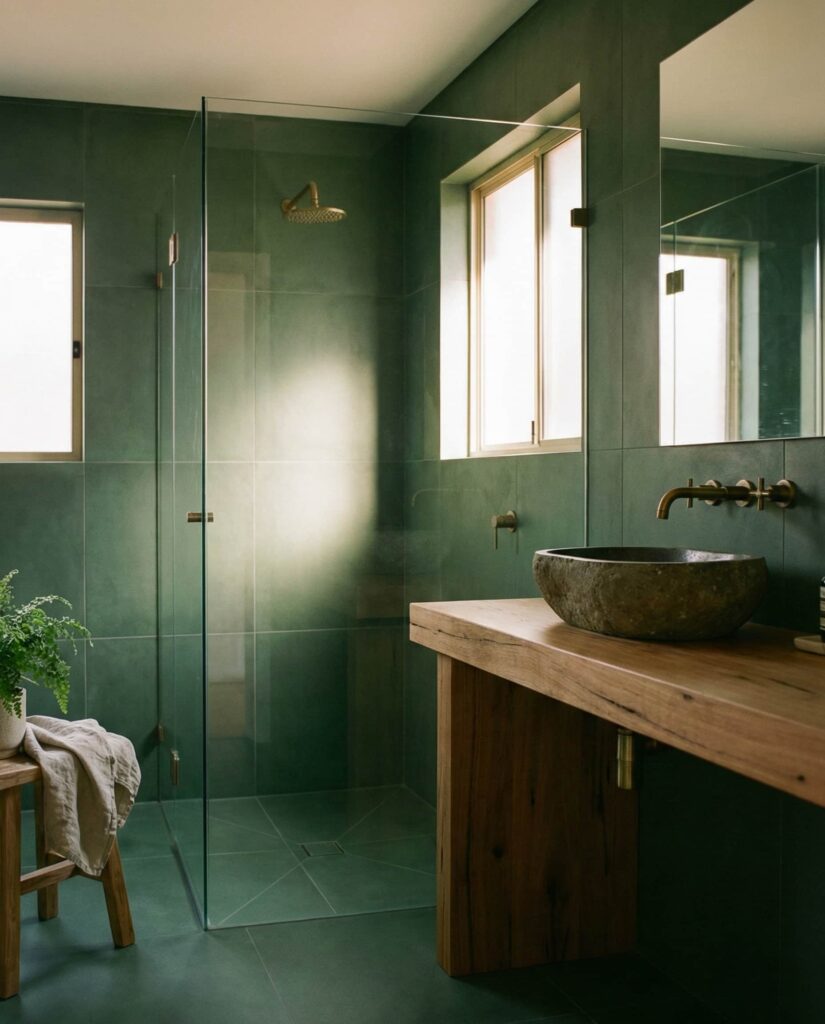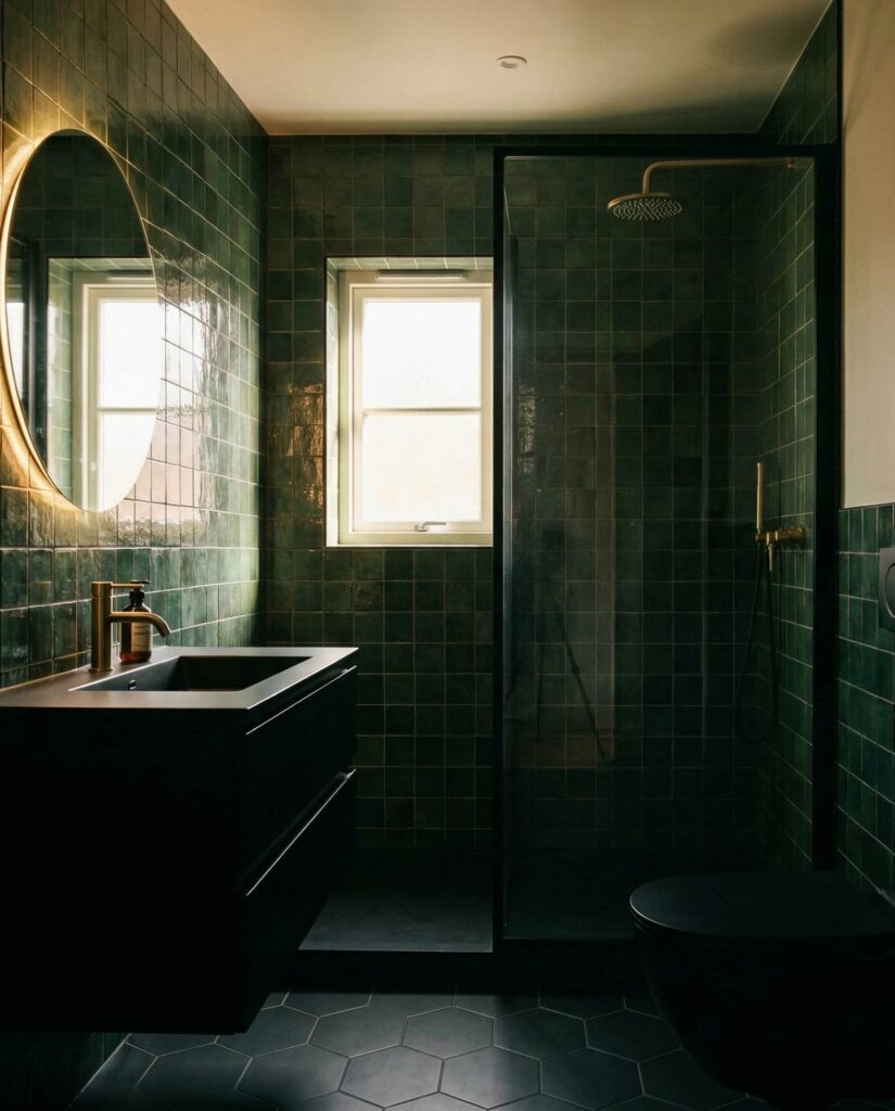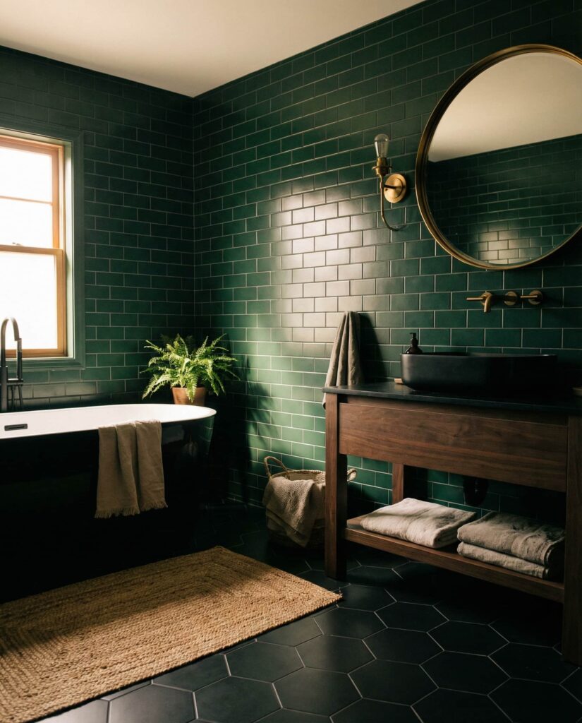 Pairing dark green tiles with a black floor creates a dramatic yet controlled bathroom aesthetic. This idea appeals to homeowners who want depth and contrast without excessive ornamentation. Designers often soften the look with warm lighting and simple textures so the space doesn’t feel cold. I’ve noticed this style works especially well in urban homes, where bold choices feel natural. The result is a bathroom that feels confident, modern, and intentionally styled.