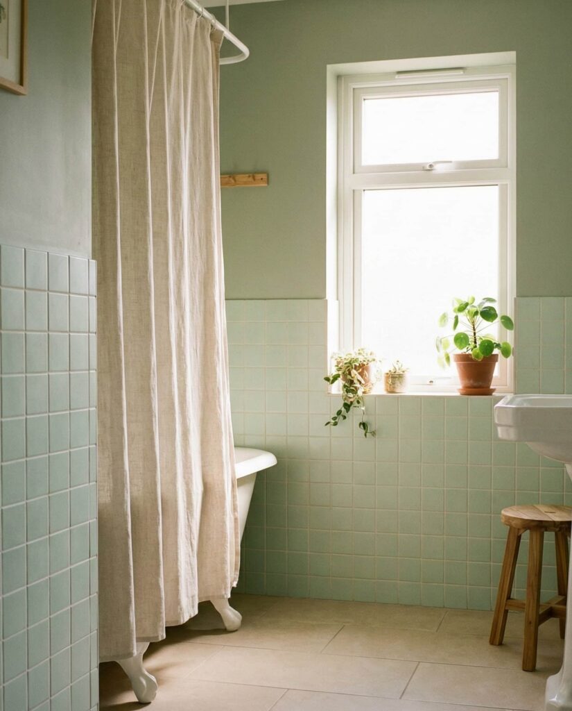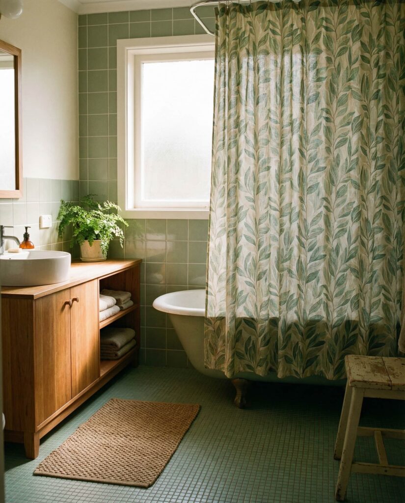 In more casual or rental-friendly updates, green tile paired with a thoughtful shower curtain can still feel cohesive. Choosing fabrics that echo sage, olive, or mint tones ties the room together without permanent changes. This idea is often recommended by budget-conscious designers who still value style. From personal experience, a well-chosen curtain can soften tile-heavy spaces and make the bathroom feel lived-in rather than staged.